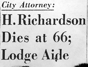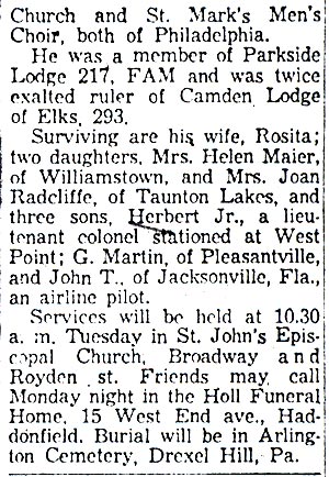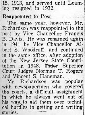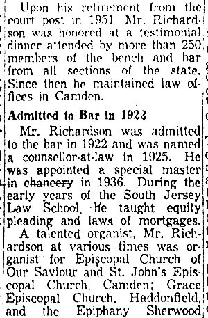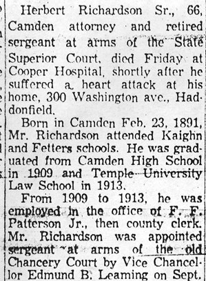 Individual Narrative of Herbert Richardson Herbert Richardson was born on Mon. 23 Feb 1891 at Camden City, Camden County, in NJ. He appeared on the census of 4 Jun 1900 at 1118 Barring St., Camden City, Camden County, NJ, in the household of his father, Richard James Richardson , and his mother, Anna Richardson He was educated at Kaighn and Fetters Schools, Camden City, Camden County, NJ He was graduated in 1909 from Camden High School, Park Boulevard, Camden City, Camden County, NJ He was employed as a clerk in the office of F. F. Patterson, Jr., Camden County Clerk, from 1910 to 1913 in the County Court House, Camden City, Camden County, NJ. He was a clerk at the court house on 21 Apr 1910. He appeared on the census of 21 Apr 1910 at 574 Chestnut St., Ward 6, Camden City, Camden County, NJ, in the household of his father, Richard James Richardson , and his mother, Anna Richardson. He was graduated in 1913 from Temple University Law School, Philadelphia, Philadelphia County, PA, with a LLB Degree On 15 Sep 1913, Herbert Richardson was appointed sergeant-at-arms of the Chancery Court, Camden City, Camden County, NJ, , serving under Vice Chancellor Edmund B. Leaming, Vice Chancellor Francis B. Davis, Vice Chancellor Albert S. Woodruff, Judge Noirman T. Rogers and Judge Vincent S. Haneman On Wed. 7 Oct 1914, at age 23, Herbert Richardson married Rosita Sherwood Martin (age 22) at 424 Haddon Avenue, Camden City, Camden County, NJ. He witnessed the will of Richard James Richardson on 30 Apr 1915 at Camden County, NJ.10 He was described as of medium height, slender, with blue eyes and brown hair on 5 Jun 1917. He was the Sergeant at Arms on 5 Jun 1917 at State of New Jersey, Chancery Court, Camden City, Camden County, NJ. He lived on 5 Jun 1917 at 1466 Kaighn Ave., Camden City, Camden County, NJ. He and Rosita Sherwood Richardson appeared on the census of 19 Jan 1920 at 1466 Kaighn Ave., Ward 13, Camden City, Camden County, NJ, with their children, Herbert Richardson Jr. and Martin G. Richardson, with Flora Bruggar listed as lodging in the household. The family owned their home; however, they did have a mortgage. He was a sergeant at arms in the court house on 19 Jan 1920.6 He was admitted to the bar as an Attorney in 1922 at NJ He was attached to Vice-Chancellor Leaming's Court on 1 Apr 1923 at Camden City, Camden County, NJ. He was a Counselor-at-Law in 1925 at NJ. He taught Equity Pleading and the Law of Mortgages during the early days at South Jersey Law School Herbert Richardson and his wife, Rosita Sherwood Richardson, and their children, Herbert, George Martin, Joan Rosita, and John Townsend, appeared on the census of 3 Apr 1930 at 1466 Kaighn Ave., Ward 13, Camden City, Camden County, NJ.. The family owned their home valued at eight thousand dollars. They also possessed a radio. He was an attorney in his own law office on 3 Apr 1930. He was appointed a Special Master in Chancery in 1936 He was a self-employed attorney on 27 Apr 1942 at W. Jersey Trust Building, Camden City, Camden County, NJ. He lived on 27 Apr 1942 at 1466 Kaighn Ave., Camden City, Camden County, NJ, Edna Mae Lovitt was listed as the person who would always know the whereabouts of Herbert Richardson in his World War II Draft Registration dated 27 Apr 1942. Herbert Richardson died on 13 Dec 1957 at Cooper Hospital, Camden City, Camden County, NJ, at age 66 years, 9 months and 20 days. Endnotes 1. Results of search for World War I Draft Records on Ancestry.com, online https://search.ancestry.com, Information from this source must be checked. This information is based on a search (probably) by name and may or may not reflect information pertinent to the person who is the subject. If this is the only source listed for this event, the event must be considered only a possibility and not an actuality. Herbert Richardson; City: Camden; County: Camden; State: New Jersey; Birthplace: New Jersey, United States of America; Birth Date: 23 Feb 1891; Race: Caucasian; Roll: 1711989; Draft Board: 3. Hereinafter cited as Ancestry.com Search, WWI Draft Records. 2. 225 West State St, Level 2, Trenton, NJ, Vital Statistics, New Jersey State Archives, formerly at 185 W. State St., (New Jersey State Library), State Registrar-Search Unit CN 307, Trenton, NJ 08635-0307. In April 2000, the Archives moved to 225 West State Street, Level 2, in Trenton. Information from the record of Herbert Richardson, . New Jersey State Library, 185 W. State St., Trenton, Mercer County, NJ 08625, . Hereinafter cited as Vital Statistics, State of New Jersey. 3. Photograph; Gloucester County Historical Society Library, 17 Hunter Street, Woodbury, Gloucester County, NJ 08096-4605, , Copy of program for Testimonial Dinner to Herbert Richardson, February 22, 1951. 4. Household of Richard J. Richardson; Camden County, New Jersey, Census of Population; (National Archives Microfilm Publication, T623.) Twelfth Census of the United States, 1900; Records of the Bureau of the Census, Record Group 29; National Archives-Mid Atlantic Region, 900 Market St., Philadelphia, Philadelphia County, PA 19107-4292, . 5. Household of Herbert Richardson; Camden County, New Jersey, Census of Population; (National Archives Microfilm Publication, T626.) Fifteenth Census of the United States, 1930; Records of the Bureau of the Census, Record Group 29; National Archives-Mid Atlantic Region, 900 Market St., Philadelphia, Philadelphia County, PA 19107-4292, . 6. Household of Herbert Richardson; Camden County, New Jersey, Census of Population; (National Archives Microfilm Publication, T625.) Fourteenth Census of the United States, 1920; Records of the Bureau of the Census, Record Group 29; National Archives-Mid Atlantic Region, 900 Market St., Philadelphia, Philadelphia County, PA 19107-4292, . 7. Household of Richard J. Richardson; Camden County, New Jersey, Census of Population; (National Archives Microfilm Publication, T624.) Thirteenth Census of the United States, 1910; Records of the Bure