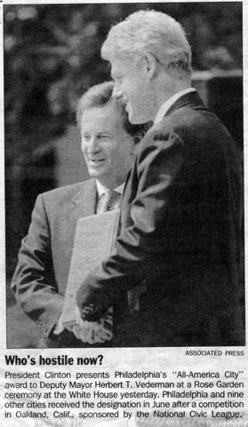 HERBERT TARTER VEDERMAN, the son of Dorothy and Joseph Vederman, comes from a family whose roots in Camden goes back to the early 1900s, the Tarter family. His grandparents, Samuel & Sarah Tarter, were well-known members of Camden's Jewish community. They were were founding members of the Sons of Israel synagogue that stood for many years at South 8th and Sycamore Streets. Samuel Tarter was in the bottling business on premises at 1142 South 6th Street, and branched out into real estate in the early 1920s. Herb Vederman was named after his uncle, Herbert Tarter, who was killed in action while serving with the 11th Airborne Division in the Philippines in 1945. His mother and aunt Evelyn were married to the principals of the Charming Shoppes, Inc., a highly successful chain of women's clothing stores. After working in the family business, Charming Shoppes, Inc., Herb Vederman embarked in 1991 on a career in public service. As part of the administration of Philadelphia mayor Ed Rendell, he played a crucial role in the revitalization of Philadelphia that took place in the 1990s. He promoted neighborhood economic development, quality of life issues and was instrumental in the redevelopment of Center City Philadelphia and many other local business corridors. After Rendell completed his two-term limit as mayor, Herb Vederman served as the Finance Chairman of the Rendell 200 campaign for the office of Governor of Pennsylvania. Since Rendell's inauguration, Mr. Vederman has worked as Senior Policy Advisor on Economic Development. His son, Jay Vederman, is a real estate developer in Philadelphia, a Partner of Rodman Properties who develops, owns and manages over 4500 multi-family units, and in Overbrook Investments LLC, a single project entity created specifically for the North Broad Street development. |