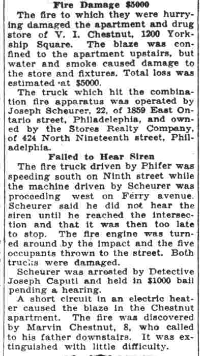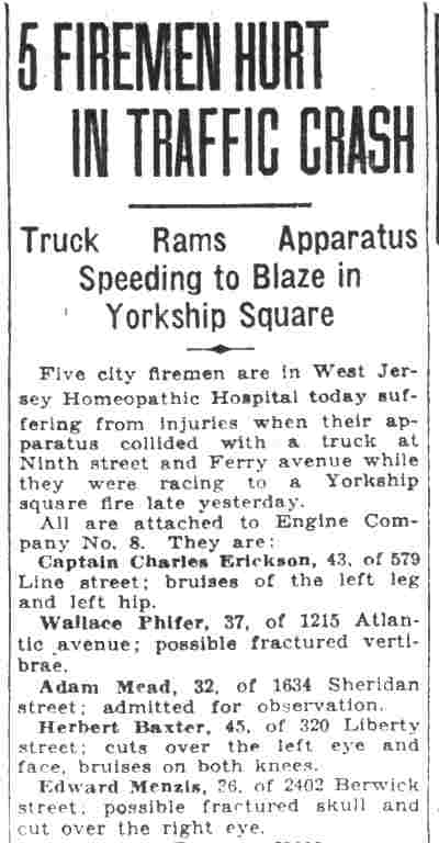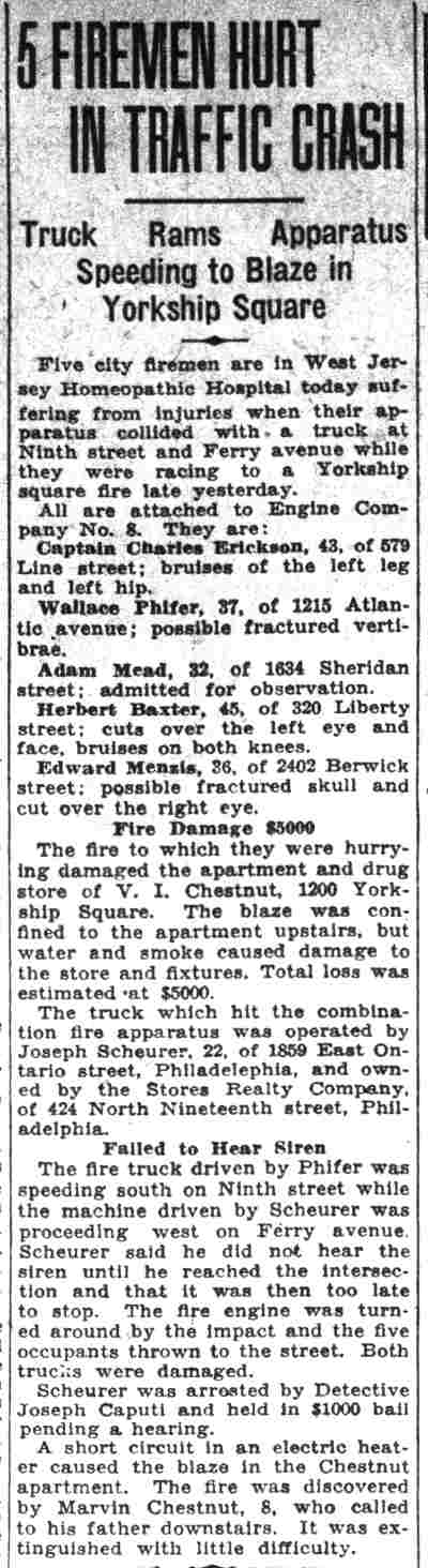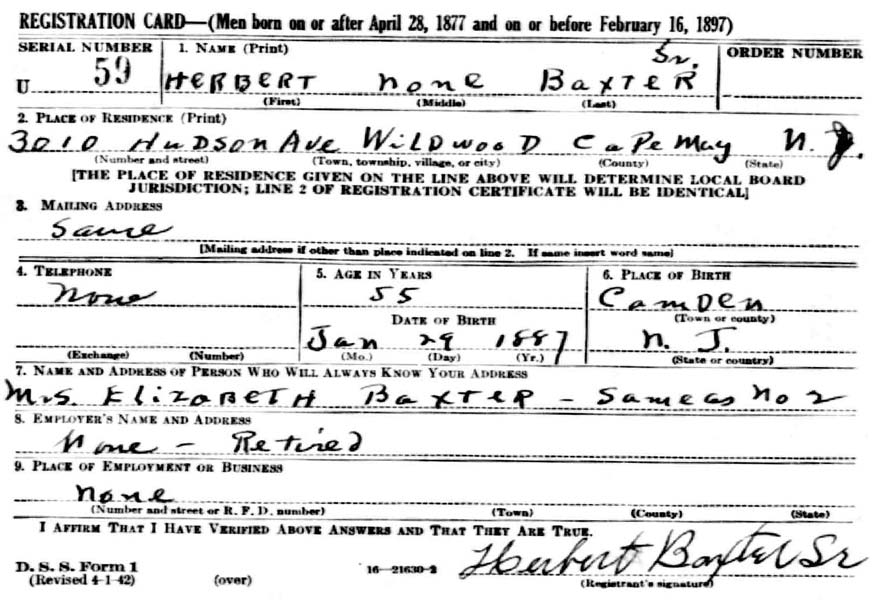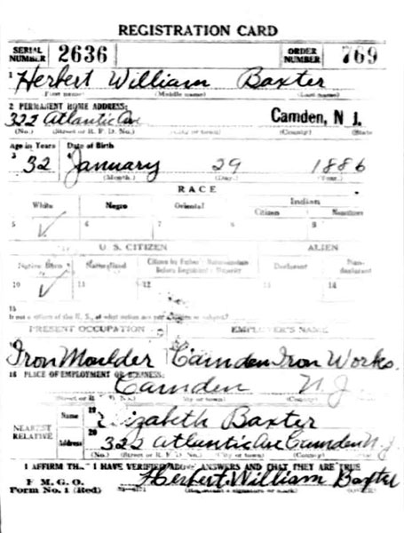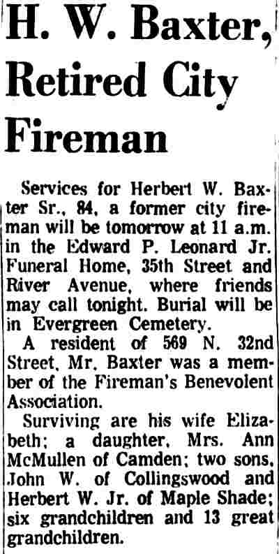 HERBERT WILLIAM BAXTER SR. was born in Camden, New Jersey on January 29, in either 1885, 1886, or 1887 to John and Hannah Baxter. For reasons unknown, he told The 1900 Census and Social Security Administration indicate 1885, the local Draft Board 1886 in World War I, and to another draft board in 1942 he gave his birth year as 1887. 1885 is the most likely year. The 1895 New Jersey Census shows the family living in South Camden in the Third Ward. When the Census was taken in 1900 Herbert Baxter, then 15, was living at the home of his cousin, Joseph Baxter, at 666 South 2nd Street. His father, by this time a widower, was also living at this location. Herbert Baxter married around 1905, and a daughter, Anna, was born in short order. The 1906 City Directory lists him at 1406 South 3rd Street. The 1910 Census shows Elizabeth and Herbert Baxter renting a house at 322 Atlantic Avenue. Twin sons, John and Herbert W. Baxter Jr. were born in 1911. Herbert Baxter Sr. was working then as a "general laborer". The family was still at that address when he registered for the draft on September 12, 1918. He had by that time gone to work as an iron moulder at the Camden Iron Works. By January 30, 1920, when the Census was enumerated, Herbert Baxter Sr. was appointed to the Camden Fire Department. The family had moved to 320 Liberty Street in and were still there in April of 1930. Herbert Baxter Sr. was a member of the Camden Fire Department through at least 1930. All three Baxter children were still living at home at the time of the Census. By 1931 he had moved to 2791 Yorkship Road, and later moved to 940 Thurman Street. By the spring of 1942 Herbert Baxter Sr. had retired from the Fire department and had moved with his wife to Wildwood, New Jersey. Later in life he returned to Camden, passing away in February of 1969, survived by his son, Herbert W. Baxter Jr. Herbert W. Baxter Jr. served with the Camden Fire Department from 1948 until his retirement in May of 1966. He was Chief Fire Marshall for the City of Camden at the time of his retirement. |