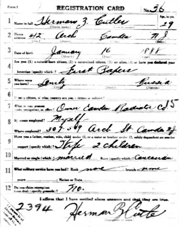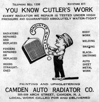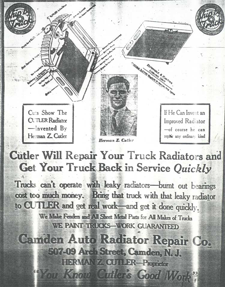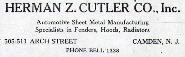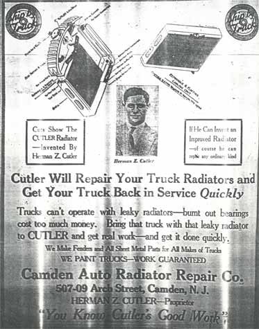 HERMAN Z. CUTLER is best remembered in Camden for the company he founded, Cutler Metal Products Company, which operated at 1021-1025 Line Street into the 1980s. Herman Cutler was born January 6, 1888 in the town of Ilintsy, in what is now the Ukraine. This town had a relatively large Jewish population at that time, and was known in Yiddish as Linitz. He came to America in 1906. By 1915 Herman Z. Cutler owned a business, Camden Auto Radiator, which was located at 505-509 Arch Street. He then lived in the next block at 412 Arch Street. Camden Auto Radiator was one of several auto repair establishments that operated on and just off of Arch Street in the 1920s and 1930s. Other shops included George's Auto Service and the Cooperson Brothers auto body shop. The 1920 Census shows Herman and Yetta Cutler living in Camden's Parkside neighborhood, at 1240 Princess Avenue with their children Dorothy, Harry, and Abraham. Also living with the Cutler family was a cousin, Abe Ostroff, who worked as an auto mechanic. Within a few years two daughters would come, Sarah and Anna. During the 1920s the family had moved to 1147 Langham Avenue. They lived a few doors away from Robert Rosengarten, who co-owned a typewriter and business machine business in Camden. Herman Z. Cutler was involved in the fundraising drive that culminated in the building of the Walt Whitman Hotel at Broadway and Cooper streets in 1925. Herman Cutler was also able to bring his parents to America from Soviet Russia, in 1929. This was no mean feat, both in getting them out of Russia and into America. The Cutler family was still in Parkside in April of 1930, at 1147 Langham Avenue. The 501 block of Arch Street was razed around 1930 during the construction of City Hall to make way for Roosevelt Plaza Park. The Parkade Building was erected on the site in the 1950s. When the 1947 City Directory for Camden was compiled, Herman Z. Cutler was living in a large house at 1501 Baird Boulevard in Parkside. He was active in the affairs of Congregation Beth El, and served as president of the synagogue in 1946 and 1947. Many prominent Camden citizens lived on this and the 1400 blocks, which lie between Kaighn Avenue and Park Boulevard. Herman Z. Cutler's next door neighbor was Jacob Naden. During the 1950s, many families left Camden for the suburbs. No exception, Herman Z. Cutler moved to 266 Bewley Road in Haddon Heights NJ. On March 25th of 1955, funeral services were conducted in the main sanctuary of Congregation Beth El for past president Herman Z. Cutler whose· years of leadership were inspiring and filled with great accomplishments. Herman Z. Cutler's new business, Cutler Metal Products Company, occupied a large buildings at 1021-1025 Line Street, between the Fleck Plumbing Supply building and Camden's original Convention Hall, which was destroyed by fire in the early 1950s. Cutler Metal Products remained in operation until 1985, when it folded in the wake of the then-current recession. Cutler Metal Products manufactured a wide variety of metal items. Their main product was the manufacture of diesel fuel tanks and air brake tanks for trucks. The firm also produced metal television cabinets, shower stalls, and bathroom partitions. The former Cutler Metal Products building, as of January 2006, is occupied by the Alpha III Group and the Exotherm Corporation. |