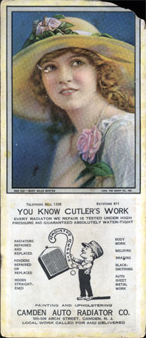 Silent film star Mary Miles Minter was featured n this advertising blotter. As Miss Minter left the film industry in the wake of the scandal following the 1922 murder of William Desmond Taylor, this card most likely was produced between between 1919 and 1922.