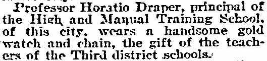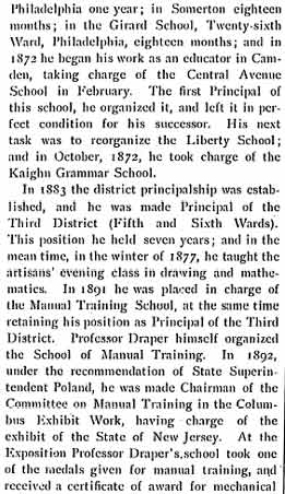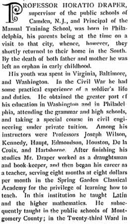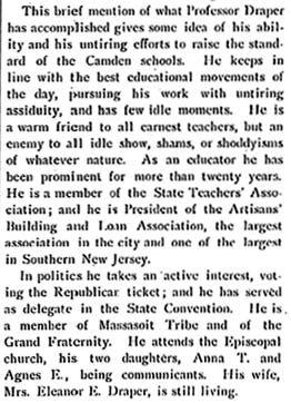 PROFESSOR HORATIO T. DRAPER may well be considered the father of the modern Camden school system. After serving in the Civil War, he completed his education, and began working as a teacher in the late 1860s in Pennsylvania. He came to Camden in 1872, and immediately made an impact in the schools of the city. Elected principal of all the schools in the Third District, which was made up of Camden's 5th and 6th Wards, he also continued to teach evening courses. He was placed in charge of Camden's Manual Training School, which became Camden Manual Training and High School at Haddon and Newton Avenues during the administration of Mayor Cooper B. Hatch at the turn of the century. In 1896 he was placed in charge of all of Camden's public schools, and he oversaw the construction of the new high school during the first few years of his tenure, which appears to have lasted until 1906. The Draper family lived at 582 Clinton Street in the late 1880s and early 1890s. They moved to 745 Wright Avenue in 1901, and the 1908 City Directory shows him as living at 719 Penn Street. Horatio Draper does not appear in the 1909 City Directory. Horatio Draper and his wife Eleanore had two daughters, Anna and Agnes. Miss Agnes Draper began teaching in Camden's public schools in 1909, and remained a teacher for over forty years. The Draper family were members of St. Paul's Episcopal Church. |