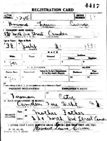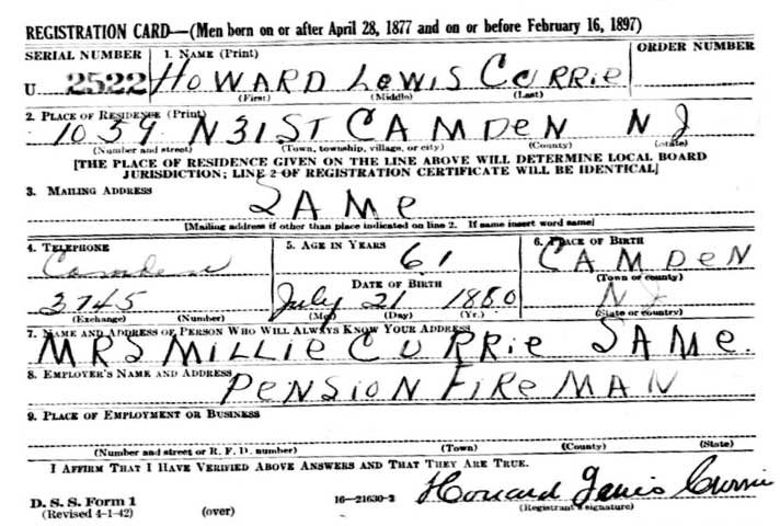 HOWARD LEWIS CURRIE was born in Camden, New Jersey on July 21, 1880 to Howard H. Currie and his wife Rose, of 434 Arch Street, Camden. His father was working as a bartender when he was born. Howard H. Currie became involved with the Camden Fire Department by 1886 as a "Call Man", although City Directories from 1887 through 1890 also state that Howard H. Currie worked as a lithographer in Philadelphia. During these years the family lived at 326 Taylor Avenue. Howard H. Currie eventually went to work full time for the Camden Fire Department. Howard L. Currie married around 1901. His wife Sarah (also known as Sadie), bore a son, John H. Currie around 1904. Howard and Sarah Currie lived with his parents through at least 1906. When the 1906 Camden City Directory was published, Howard L. Currie was working as a conductor for either the streetcar line or the railroad. His father, Howard H. Currie, was at that time on the Fire Department. The family was living at 109 North 4th Street. The 1910 Census shows that Howard L. Currie had moved with his wife and son to 214 Point Street. he was then working as a switchman for the railroad. By mid-1912 Howard L. Currie had joined the Camden Fire department. He was still living at 214 Point Street with his wife, Sadie. His father was still with the Fire Department as well, however, by 1914 Howard H. Currie had retired from the department. He was still living at 109 North 4th Street. By September of 1918 Howard L. Currie's marriage had ended in divorce. He was living with his parents at 220 North 3rd Street, and no mention of a wife is on his draft card. Howard H. Currie died at some point in time between September 12, 1918 and January 1, 1920. The 1920 Census shows that Howard L. Currie was living with his son John and by this time widowed mother at 220 North 3rd Street. Shortly after the Census was taken Howard Currie remarried. The City Directory for 1924 lists him at 933 North 4th Street with his wife, the former Millie Ericson. His son John remained behind to take care of his grandmother. The Curries had moved to 1135 Beideman Avenue in Cramer Hill by 1929. By April of 1930 they had again moved, to 1059 North 31st Street, also in Cramer Hill. Howard L. Currie had retired from the Fire Department by the summer of 1942. He was still living with his wife Millie at 1059 North 31st Street in Camden's Cramer Hill neighborhood. He was still residing at that address, and supplementing his income working as a watchman, when the 1947 Camden City Directory was compiled. It is unclear as to when Howard L. Currie passed away. He was still listed in New Jersey Bell Telephone directories at the North 31st Street address as late as the fall of 1980. His wife, Millie Currie, died in September of 1981. |