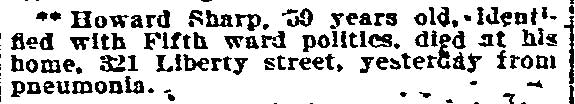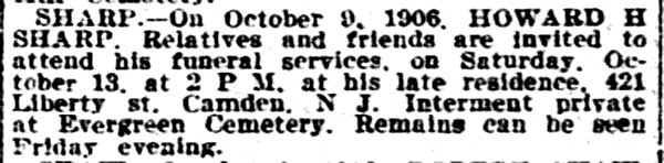 Howard H. Sharp was born in Camden, New Jersey in July of 1847 to Charles Sharp and his wife, the former Susan Stokes. The family was living in Camden's South Ward when the census was taken in 1860. Charles Sharp worked as a tailor. Besides Howard, the family included brothers Horace, John, Lewis, William, Ellis, Charles H., and Edward. Howard Sharp married Amanda Frances Powell in 1870. Howard Sharp worked as a laborer during his years with the Fire Department, he later worked as an engineer, a butcher, a salesman, an advertising agent, and in his last years as a special officer. Howard H. Sharp is listed in the 1878-1879 Camden City Directory at 454 Kaighn's Point (Kaighn) Avenue. By 1880 he had moved to 420 Sycamore Street. The 1881-1882 City Directory shows him living at 1128 Broadway. City Directories from 1882 through 1884 lists him at 338 Sycamore Street. The 1885 Directory has him at 271 Liberty Street. The Directories from 1887-1888 and 1888-1889 have him at 332 Sycamore Street. Howard H. Sharp was living at 280 Walnut Street in 1890. City Directories from 1893 through 1896 give Howard Sharp's address as 14 Bella Place. In 1897 he moved to Stockton, which would become East Camden in 1899. He made his home at 2620 Master Street, which was renamed Cramer Street after the unification of Stockton and Camden. Howard H. Sharp was still living there when the Census was taken in 1900. When the census was taken in 1900 Howard H. Sharp's wife Amanda were the parents of seven children, five of them, Arabella 'Bella", Ida May, Samuel, Susan, and Mary "Mamie" Sharp still living. Howard H. Sharp had moved to 421 Liberty Street by 1906. He died of pneumonia at his home on October 11, 1906. |