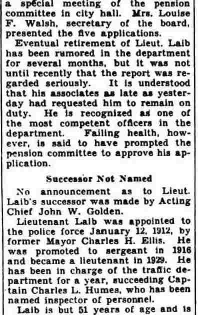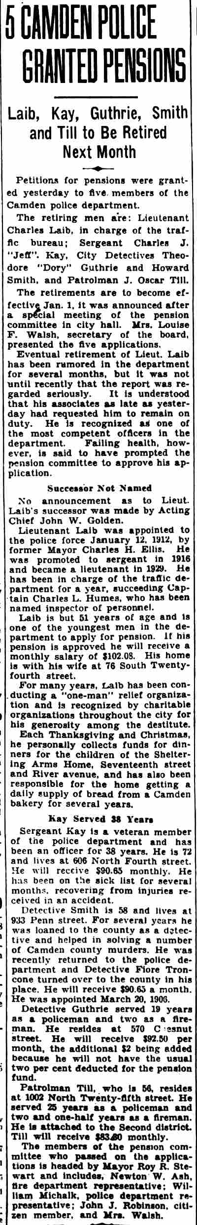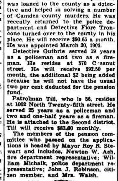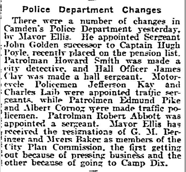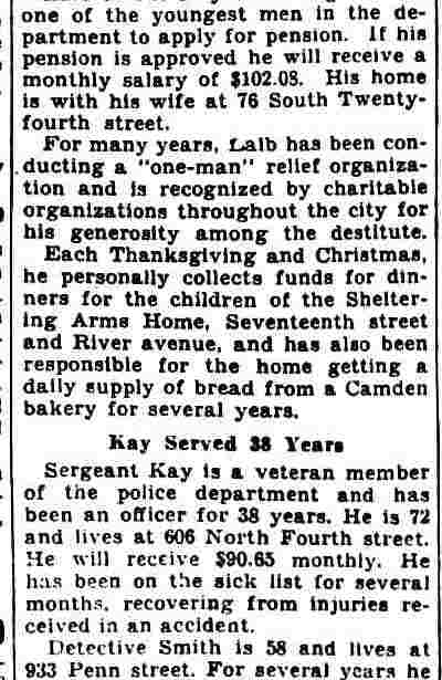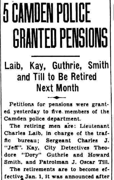 This story erred in reporting, as retirement at age 65 was NOT mandatory at the time. William E. Albert, Richard Golden, Frank Matlack, and Edwin Thomas did retire. john golden, john painter, Charles Fitzsimmons, Thomas Brothers, and William Lyons continued to work in the Police Department. john golden was eventually promoted to Chief of Police. |