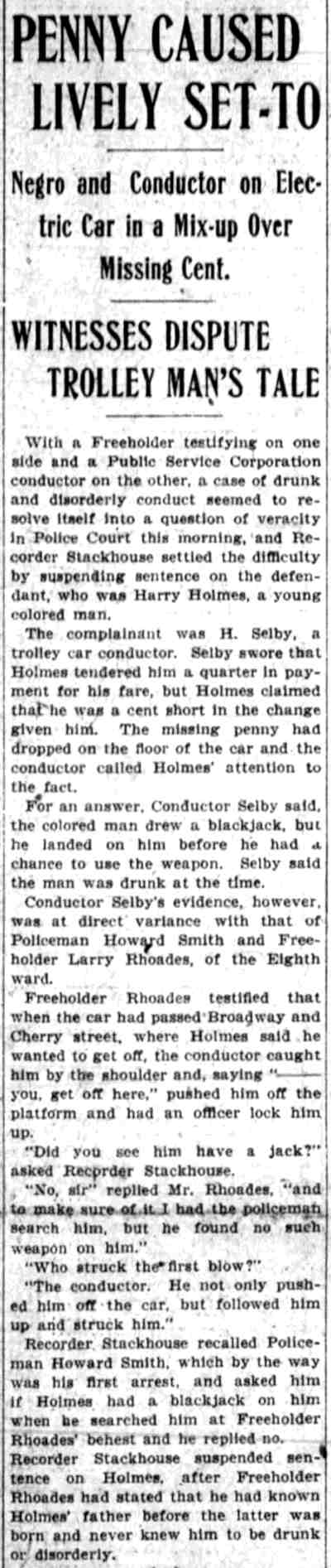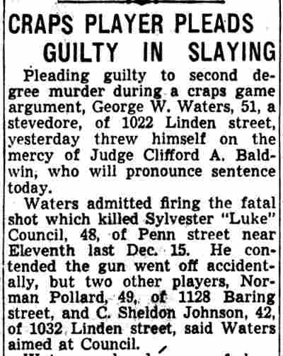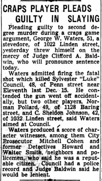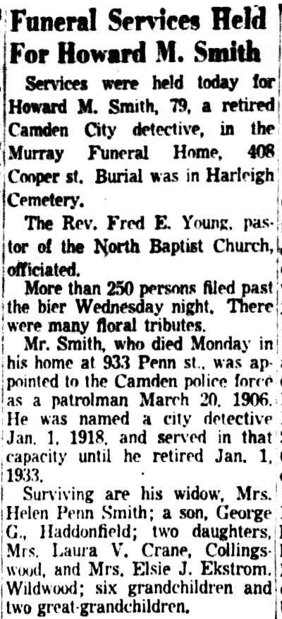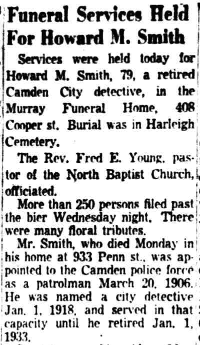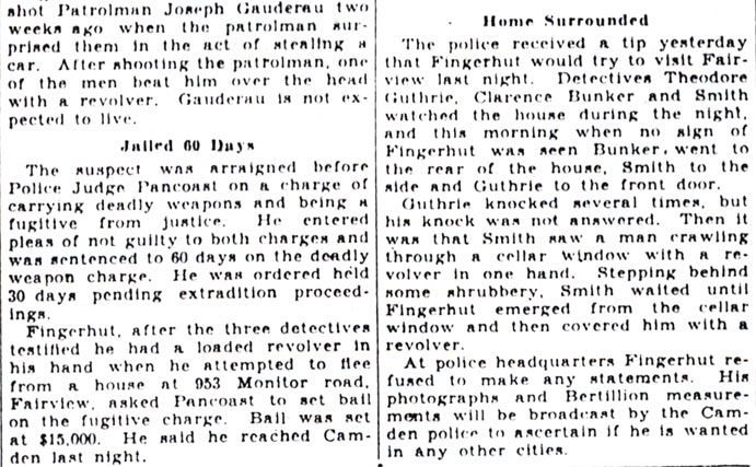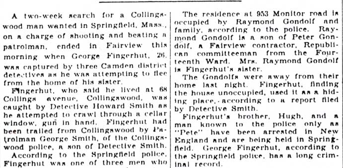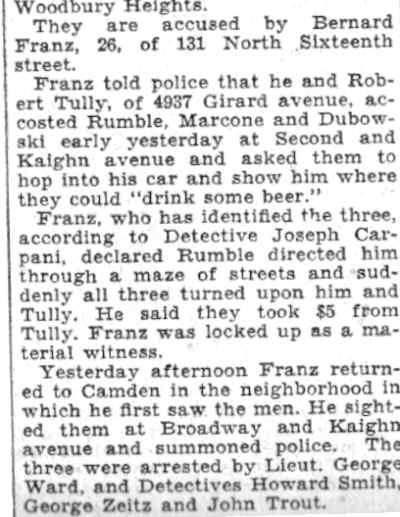 MOTIVE AT G.O.P. CLUB SPLITS SLEUTHS With city and county authorities definitely divided on the motive and circumstance if the Sixth Ward Republican Club slaying, Joseph "Polack Joe" Deven was arraigned in Camden police court today and held without bail on a murder charge. Through County Solicitor Walter Keown, retained as his attorney, Deven waived a police court hearing and was held to await grand jury action in the slaying of Joseph Cimini, Philadelphia gangster, at the political club early Saturday morning. At the same time County Prosecutor Ethan P. Wescott announced his operatives had abandoned the theory Cimini was killed as the aftermath of an attempted hold-up, and were concentrating their investigation in the case on an effort to "find the woman'. Statements of witnesses to the fatal shooting, the prosecutor added, made no mention of a hold-up, but contained the declaration that Cimini had been shot as a result of a feud with Charles "Chick" Hunt, former South Camden pugilist, concerning the affection of "Chick's girl". Police Claim Holdup On the other hand, Captain John Golden , chief of the city detective bureau, declared he was unable to recall any mention of a girl in the statements obtained from witnesses, and added emphatically that his department still held the shooting had followed an attempted holdup of the club by Cimini and Joseph 'Mose’ Flannery. Flannery and Hunt were both witnesses to the shooting by Deven, picturesque figure in Third Ward politics, which occurred at the Sixth Ward Club 's headquarters, 908 Broadway. . After Deven had appeared in Police Court today, Flannery was arraigned as a material witness and as an accessory to the crime, with an additional charge accusing him of carrying concealed deadly weapons. Similar charges were made against Russell Sage, a taxicab driver, who arrived at the club with Flannery and Cimini early Saturday morning. These two were committed to the county jail without any bail by Judge Bernard Bertman. Hunt, however, was released under $1,000 bail as was Martin O'Brien, 27 years old, a former New Jersey State Trooper, and Harry Waterhouse, 28 years old, 1102 Marion street. Three Others Arrested During the day the police continued to build up their case against Flannery by arraigning him on the charges made by Milton Feinstein and Henry Mehrer. The also arrested Joseph Genther, 29 years old, 414 Atlantic Avenue; Robert Wolfe, 21 years old, 1106 mechanic Street , and Eli Conaghy, 27 years old, 814 South 6th Street. Wolfe, who is Flannery's brother-in-law, and Genther were held "on suspicion" of having been with "Mose" at the time the latter is declared to have attacked and attempted to rob Mehrer, an Audubon policeman, outside the Ringside Inn, on the Black Horse Pike. Conaghy, Flannery and Sage were arraigned and held without bail on charges of threatening to kill Feinstein and of carrying concealed deadly weapons. Feinstein declares these three with Cimini, the slain man, entered his cafe on January 2 and attempted to hold him up, threatening to kill him if he refused to “come across”. When he defied them by telling them to “go ahead and shoot”, Feinstein says, they departed. Wolfe, Genther, and Conaghy were arrested by City Detectives George Ward and Thomas Cheeseman. It was Cheeseman who lodged the formal complaint of murder against Deven. Two Others Released Two other men who were questioned in connection with the murder case were in court this man but neither was held. They are Newton Blanchard, 923 St. John Street , a former boxing referee and alleged “stick man” at the crap game declared to have been in progress at the club before the shooting, and Michael Dandrea, 26 years old, of 1657 Norris Street. Both men had been released after questioning on Saturday. Police say they are the men who told police that trouble was imminent at the club and that “Flannery and another fellow are trying to stick up a bunch of other fellows.” The city police hold-up theory was further attacked today by Francis J. McCarthy, a Philadelphian, who arrived before noon at the county prosecutor’s office and said he would co-operate with the authorities. He wishes to clear the dead man, he said, of the stigma of suspicion that he was slain while engaged in an attempted robbery. Hearing in Police Court was brief. There was no testimony and Keown merely announced Deven would waive a hearing. Appearing also as attorney for Hunt, O’Brien, and Waterhouse, he said the other three men were “present at the unfortunate shooting” and thus should be held as material witnesses. He added the prosecutor’s office had permitted the release of the three under $1,000 bail each and requested Judge Bertman follow suit. The court acceded to this request but stipulated that new bail must be provided. The three men were freed shortly afterward when the bond was furnished by James Louis, 603 Kaighn Avenue, who had provided the bail yesterday in the prosecutor’s office. Despite the declaration by two Camden district detectives who were present at the time and who said there was no evidence that gambling was in progress at the club, county detectives disclosed today that statements of the shooting contained the assertion that the men had gathered for a crap game. These witnesses also declared the fatal shooting resulted from an argument over a woman for whose attention Cimini and Hunt were rivals. In circles where the leading figures in the shooting move, it was freely predicted things would be fixed up for Deven and that Flannery, political worker and supposed gangster, was to be "made the goat". Flannery is blamed by the city police for precipitating the battle. he has also been identified, according to County Detective Howard Smith, as one of the men who beat and robbed Henry Mehrer, an Audubon policeman, outside the Ringside Inn on the Black Horse Pike a fortnight ago. In addition, he is charges with attempting to hold up Milton Feinstei