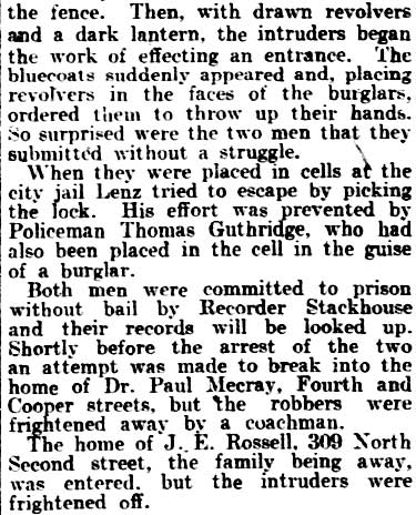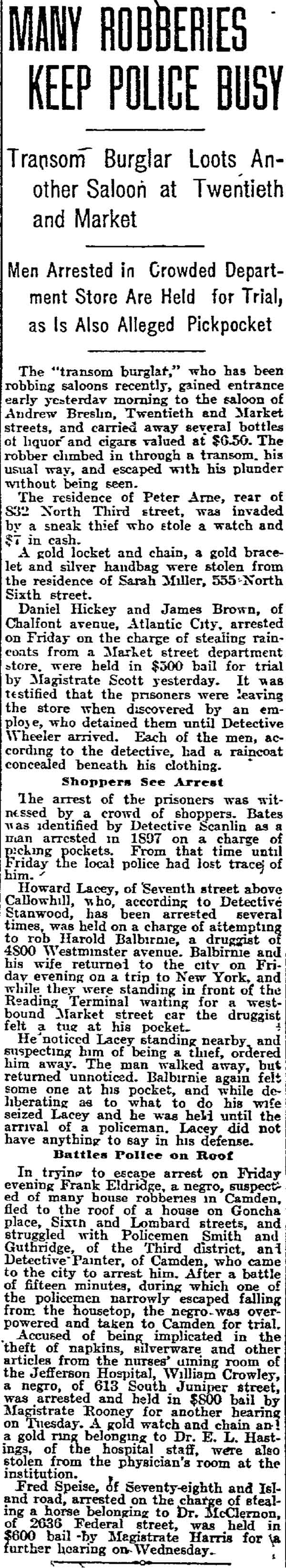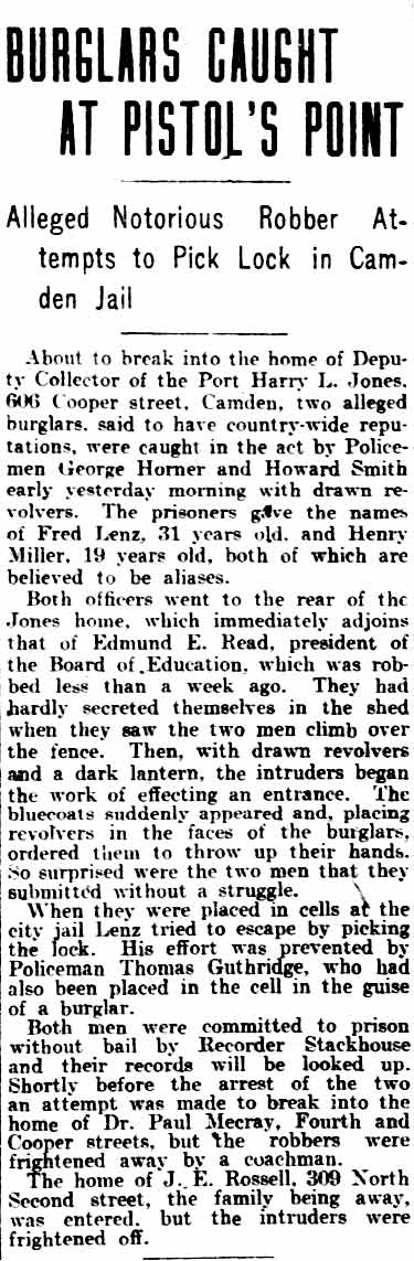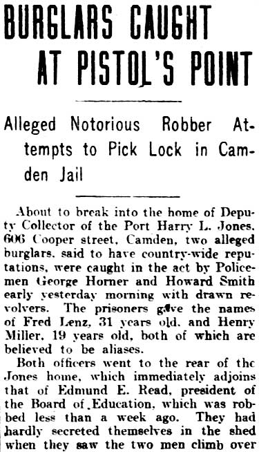 Murdering one jailor and wounding another with a revolver that had been smuggled into them by outside confederates, Wilson T. Ashbridge, slayer of Mrs. Elizabeth Dunbar, and Francis Murphy, alias George E. Thompson, a check forger, made their escape from the county jail a few minutes before seven o'clock last night. Ashbridge with his wife was caught at noon in the Keystone Hotel in Chester PA where they registered at one o'clock this morning. Thompson is still at liberty but from the confident manner of Prosecutor Kraft his early arrest seems assured. The murdered jailor was Isaac Hibbs, aged 65 years of 913 South 8th Street. The wounded keeper is Joseph Ellis, aged 45 years, of 416 Carteret Street. Shot twice, he is in Cooper Hospital. His condition today is very satisfactory. Thompson, who is 41 years old, forged a check for $650 which he gave to V.M. Fulton as part of the purchase price of an automobile. The forgery was discovered before the deal was completed and his arrest followed on June 8. he also passed a forged check for $15 on State Motor Vehicle Agent Kraft. He, too, was awaiting trial. In spite of the positive evidence against him Thompson had spurned all efforts to have him plead guilty and it is now believed that he was sparring for time while hatching a plan to escape. He s no doubt the master mind. R.L. Hunter, a farmer of Bensalem Township, Bucks County PA, about four miles above Torres dale, reported to the Philadelphia police the morning that he had seen a man answering Ashbridge's description on the Bucks Road at daylight. The man asked the way to Riegelsville. According to Hunter, the man was dressed in a dark suit, and had no hat. His clothing was wet. Hunter did not see anything suspicious in his actions, and after giving him directions, they parted. Upon seeing the paper with a picture of Ashbridge, the farmer was struck by its resemblance to the man with whom he had talked. He hurried to Tacony and notified the police. The State police, who patrol that section of the county, and who have an office at Langhorne, were immediately notified as were the surrounding towns. The shootings took place in different parts of the jail. Hibbs was murdered in the exercise room just outside the cell room on the Sixth and Arch corner of the building. Ellis was shot down in the corridor just outside the Market Street end of the building when he heroically grappled with Ashbridge after the latter had pointed a gun at his head. In spite of his wounds Ellis dragged himself to a telephone and after notifying Police Headquarters of what had happened he collapsed. Only one of the two bullets is still in Ellis. It entered the groin on the right side and is buried in the muscles of the leg, having taken a downward course for seven or eight inches. The other bullet struck Ellis in the right breast and came out in the left breast, traversing the upper fleshy parts of the body. Hibbs was almost instantaneously killed by a bullet that went within an inch of his heart, producing a hemorrhage. The bullet was extracted this morning from the body early this morning in an autopsy performed at the morgue by County Physician Stem. In spite of the fact that it is pretty well established that three shots were fires in the attack on Hibbs, only one of the bullets took effect. "But it makes little difference which of the two men handled the gun" said Prosecutor Kraft this morning. "Both are equally guilty of this murder and what we are concerned about now is the recapture of the gunmen." Mr. Kraft added that it his purpose to examine all of the prisoners in that part of the jail where Hibbs was murdered to determine fully who fired the fatal shot. The escape had been carefully planned and timed to the minute. Of course the desperate prisoners were aided by confederates on the outside and it is the general belief that a high powered motor car was in waiting for them not far from the jail. They are known to have been in possession of money and openly boasted yesterday that it was their intention to leave the prison last night. These boasts were made to two young ladies connected with a religious organization who called on the tom men yesterday to offer spiritual reconciliation. The girls are frequent visitors to the jail and naturally their efforts at evangelization were directed in the main toward Ashbridge, because of the fact that he was accused of murder. These girls, whose identity officials will not disclose, were closeted with Prosecutor Kraft until one o'clock this morning. Both declared that on their visit yesterday they were told by Ashbridge and Thompson that it was the last day they expected to spend in jail. "We are going to get away from here tonight and we've got money to help us after we are out " said Ashbridge, who further told the girls he had considerable cash sewed up in the waistband of his trousers. The girls begged the prisoners not to do anything that would cause them more trouble and they told the Prosecutor that Ashbridge and Thompson promised them that they would not make any effort to escape. In their talks with the girls neither of the prisoners said a word that would indicate that they would kill if necessary to escape. The full force of their boast did not dawn on the religious workers and for this reason it never occurred tot hem to inform the Sheriff of what the prisoners had in said. A general jail delivery of at least all the men confined in hat is known as the untried department, where the two were held, was only averted by the prompt arrival of the police on their beat, which was made easy by means of the keys taken from the prostrate body of Hibbs. Ashbridge and Thompson left all of the doors open and the vanguard of the inrushing police found the prisoners swarming all over the corridors on the east side of the prison. In the wild excitement following the double shooting and escape none else thought of freedom and a checking up of the inmates after they had been h