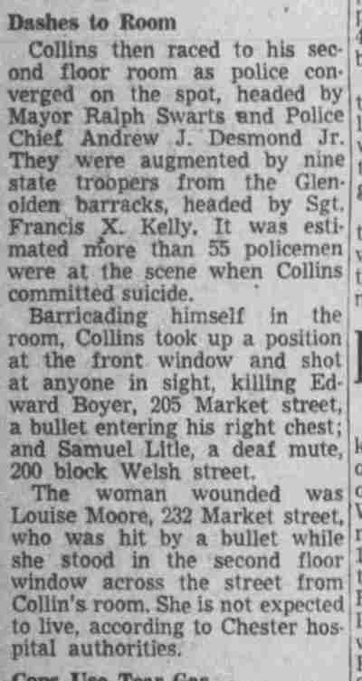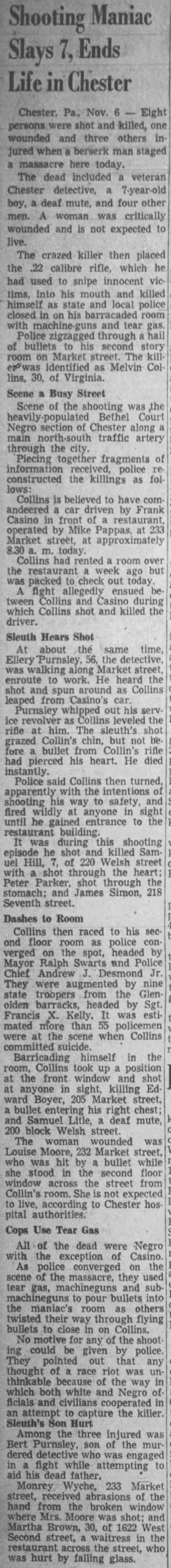 Howard Unruh has been, and unfortunately will continue to be, called America's first mass shooter. This is COMPLETELY UNTRUE . There were several other similar incidents, including the one described below, where a sniper killed seven people before taking his own life in November of 1948 in Chester, Pennsylvania, than 24 miles away from Camden and only 10 months before Unruh's killings.