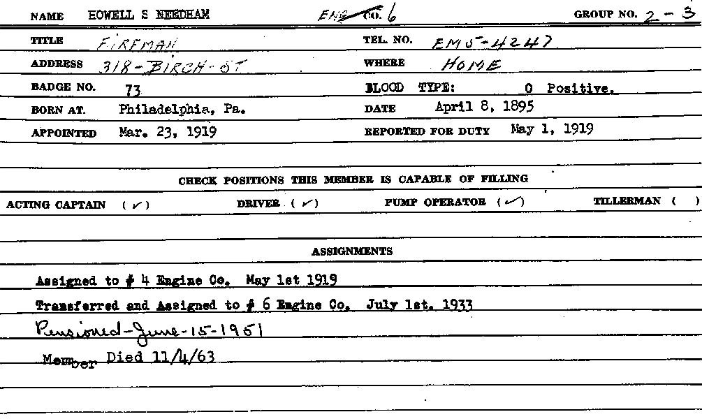 Howell S. Needham was transferred to Engine Company 6 on July 1, 1933. By 1946 he had been promoted to Captain.