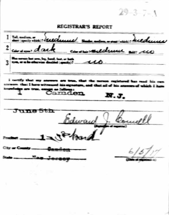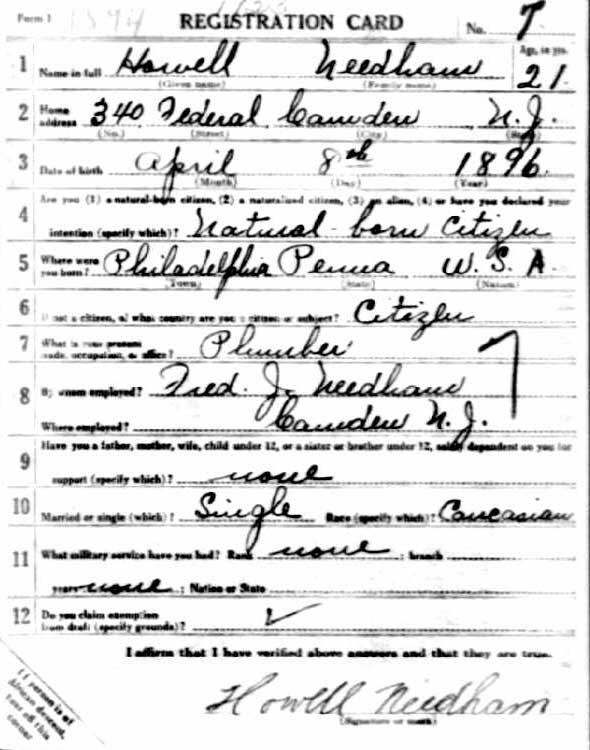 HOWELL S. NEEDHAM was born in Philadelphia, Pennsylvania on April 8, 1895 to Fred and Emma Needham. The family, which included older brother James, was living at 114 Birch Street in North Camden when the 1898 City Directory was compiled and were there when the 1900 census was enumerated. Fred Needham worked as a plumber to support his family. By 1906 the family had moved to 132 Birch Street. The 1910 Census shows the family at 639 Grant Street. By 1914 the Needhams were living at 340 Federal Street, and Howell Needham was working as a plumber alongside his father. The family was still at 340 Federal Street when Howell Needham registered for the draft in June of 1917. He was called to service the following year.