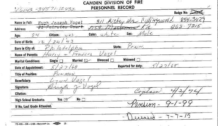 making others laugh. Kay Haffey Wood REST IN PEACE ~ JOE ANYZEK My Heart and Prayers are with all of the Vogel Family; Rest In Peace Hugh ~ Anthony R. Venella, Clementon, New Jersey To Hughs' family , my condolences to you. I had the pleasure of working with Hugh in the C.F.D. and in our Union. He was a good firefighter and a great person. He always made us laugh and always had that smile on his face. . He will be missed , sorry for your loss. ~ Sonny Frett So very sorry for your loss. He is now watching over you from heaven with Carm. Love, John and Mary ~ John & Mary Tanealian, Bellmawr, New Jersey Our Hearts Are