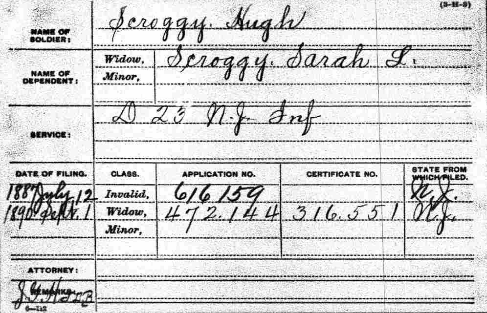 HUGH SCROGGY was born in 1828. The 1850 Census shows him single and living with farmer Josiah Prickett in Southampton Township, Burlington County, where he most likely worked as a laborer. The 1860 Census shows Hugh Scroggy was married. He lived with his wife, Sarah L., son Alfred, and daughter Lizzie, lived in New Hanover Township, Burlington County where he worked as a day laborer. A son, Richard, was born on February 23, 1861. Another son, Edwin, was born in 1863. On August 26, 1862 Hugh Scroggy enlisted in the Union Army. He served as a private with Company D of the Twenty-third New Jersey Infantry from September 23, 1862 to June 27, 1863. The 1870 Census shows him living in Pemberton, New Jersey with his wife and four children. Hugh Scroggy was living with his wife Sarah and son Edwin (Edward in the Census) in Evesham Township, New Jersey when the Census was taken in 1880. He was working as a foreman on a farm. When the City Directory for 1881 was compiled that listed residents of Burlington, the Scroggy's were listed. In the mid-1880s Hugh Scroggy moved to Camden, New Jersey. He is listed in the 1887-1888 City Directory at 234 Main Street. On July 12, 1887 he filed for his Civil War Invalid's Pension. High Scroggy died in Camden on March 23, 1888. He was buried in the Soldiers Plot in New Camden Cemetery. A Hugh Scroggy is listed in the 1888-1889 City Directory as being in the produce business on Washington Street, near South 3rd Street. However, Sarah Scroggy, his widow is listed at 414 North Front Street. Sarah lived in Camden until her passing in 1915. The 1893 Directory has her at 113 Pearl Street, her daughter Lizzie Egbert lived at that address from 1890 through 1894. The 1895 and 1897 editions shows Sarah Scroggy and the Egberts at 528 North Front Street. From 1899 through 1902 her address was given at 36 North 4th Street. Directories from 1903 through 1905 show her at 507 Pine, this is probably an error, as she is listed in further Directories and the 1910 Census at 507 Vine Street. The 1910 Census shows Sarah Scroggy living with her widowed daughter Elizabeth Egbert and granddaughter Rhoda at 507 Vine Street in North Camden. Son Edwin was living in Clementon at that time with his wife and children. Aroiund