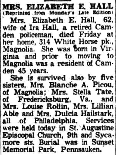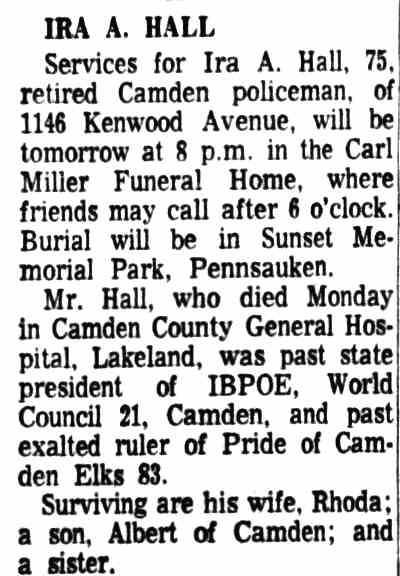 IRA ALBERT HALL was a Camden police office active in the early 1920s, active in Camden's Third and Fifth Wards. He was born in Providence, Rhode Island on June 25, 1889 to Henry S. and Elizabeth Hall. The family had come to New Jersey by 1894. By 1900 the family had moved to Camden. When the Census was taken in the summer of 1910, the Hall family, which included step-brother Eugene Edwards and younger brother Joseph, resided at 1810 Mulford Street in Camden's Centerville neighborhood. When he registered for the draft on June 5, 1917 Ira Hall was living at and working as a steward at the Riverton Country Club in Riverton, New Jersey. He had returned to Camden by January of 1920. The census shows that he was living on Berkley Street in South Camden, and that his occupation was "real estate". His next door neighbor was a carpenter, Clarence Arthur. On September 2, 1920 Ira A. Hall was appointed to the Camden police department, possibly through the influence of Detective George V. Murry. Late in 1921 drug trafficking and police corruption in Camden's Third and Fifth Wards had become so flagrant that an investigation was launched. Office Hall along with Camden police officers William Draper, Tony Latorre, and Detective George V. Murry were summoned to City Hall to answer charges placed by City Council's police committee, Murry being the man target of the investigation. By January 21, 1922 Murry, Draper, and Latorre had resigned, and Hall was fired after a hearing. George Murry apparently died under "mysterious circumstances" on January 29, 1922, shortly before he was to go on trial for graft. George Murry's political empire was taken over in part by Polack Joe Deven, who held sway trough most of the 1920s until sent to jail as a result of a shooting at the Sixth Ward Republican Club on Broadway. With Murry's death, the investigation collapsed. No criminal charges were brought against Ira Hall. The 1924 Camden City Directory shows that he was working as a "steward", possibly having returned to his job at the golf course. He was then living at 1016 Newton Avenue. Ira Hall does not show up in the 1927 Camden City Directory, but by 1929 he had returned to the city and had been reinstated into the police department. Ira Hall was still active as a police officer as late as 1949. He retired on pension in the mid-1950s.. Ira Hall and his wife Elizabeth were living at 1132 Mount Ephraim Avenue when the 1929 Camden City Directory was compiled, and remained at that address through the spring of 1942. This also for a time was the home of Camden firefighter Charles W. Cooke and his wife Esther. The Census indicates that Ira and Elizabeth Hall were their brother- and sister-in-law. The 1947 Directory shows him at 220 North 11th Street. He later moved to 1146 Kenwood Avenue. Ira Hall retired in the mid-1950s. His wife Elizabeth E. Hall passed away in July of 1958. Ira Hall married again. His wife Rhoda Johnson had one son, Albert Jones, who, after serving in the United states Army, became a member of the Camden Fire Department, Ira Hall was active with the Pride of Camden Lodge 83, I.B.P.O. of Elks, who for many years had a lodge at 711 Kaighn Avenue. By 1933 he had already serves as state president of that organization. Ira Hall's last days were at the Camden County General Hospital at Lakeland, near Blackwood, NJ. He died in June 13, 1966. |