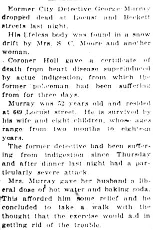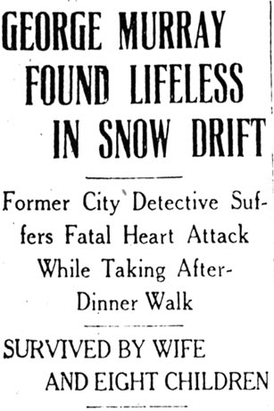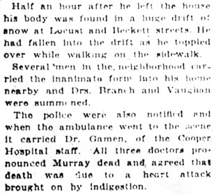 Detective Murry Drops Dead In Street George Murry, ex-city detective, who resigned from the police department after being charged with promoting vice In the Third and Fifth Wards, was found dead on a doorstep near Locust and Line Streets shortly after nine o'clock last night. A death certificate issued by Coroner Holl ascribes Murry's death as due to apoplexy, superinduced by acute indigestion. Grand Jury Probe Starts Murry's death came as a tragic aftermath of his exposure as a protector of prostitution and dope selling in the downtown tenderloin, in the role of which he is said to have amassed a snug fortune. His death automatically puts to an end the proceedings that were begun to present his activities in the tenderloin before the Grand Jury with a view of bringing criminal prosecution. Murry will be buried Thursday afternoon at Mt. Peace Cemetery, of which he was part owner. Funeral services will be conducted at the home and in the Macedonia Church, 3rd and Spruce Street, at noon. Neighbors Find Body Murry was 50 years old. According to his wife, Mrs. Cora J. Murry, former city detective had been suffering for several days with indigestion. After supper last night, Mrs. Murry said, her husband complained of feeling ill and she gave him a tablespoon of baking soda. He shortly after decided to take a walk in the belief the air might benefit him. Half an hour later, neighbors came upon his lifeless body across a doorstep on Locust street, between Beckett and Line Streets. The body was carried to the Murry home, at 649 Locust Street, a few doors away. Two physicians were called. Owing to the storm, the doctors were delayed in reaching the house. Dr. Clement T. Branch, of 721 Walnut Street, the first physician to arrive, said he believed Murry had died as he fell. Mother Died 2 Years Ago, Same Hour Besides his widow, Murry is survived by eight children, ranging in age from two months to 18 years. Curiously, Murry's mother died exactly two years ago, to the very hour. Murry was colored, although many persons were unaware of his race because of his light complexion. He was a tall, powerful man. He was more than six feet in height and weighed about 230 pounds. His complexion was ruddy and his hair iron gray. Murry’s death was a passing incident in the tenderloin today. Before he was shorn of his power, which he wielded proudly and with great vigor, his decease might have caused a great flurry. Murry, in the height of his power, was formidable, and a man whose favor the denizens and habitués of the underworld crave; stripped of that power, he was ignored and deserted as rats would desert a sinking ship Boss For Many Years His loss of power probably worried Murry more than the outcome over the exposure of the criminal phase of the exposure. Murry had been the undisputed political “boss” of the Third and Fifth wards for years. The transition was to great; his fall too disgraceful. Prosecutor Charles A. Wolverton pointed out today that with Murry dead, the presentation of evidence of vice conditions in the Fifth Ward to the Grand Jury would be dropped for the present and in all probability for good. The reason is obvious, said Mr. Wolverton. “There’s nobody to convict.” United States Started Probe Murry’s downfall was due largely to the activities of attaches of the United States Interdepartmental Social Hygiene Bureau, who investigated vice conditions here at the request of the Camp Dix military authorities. Officers of the camp complained many of the men had contracted contagious diseases during visits to the tenderloin in South Camden. A series of meetings was held under the auspices of the bureau and a number of women prominent in social welfare work in the city. With the co-operation of the Federal authorities, the local police began a “cleanup” of the tenderloin. No one was spared. Dope peddlers, prostitutes, bootleggers and gamblers fell in the clutches of the authorities. Questioned, their stories seemed to coincide on one fact- that Murry was the “invisible government” which sanctioned or frowned upon their industry and who had to be “greased” if they wished to ply their trade without molestation or criminal prosecution. Three Other Members Accused Three other members of the police department were accused of malfeasance along with Murry. They are Policemen William Draper, Tony Latorre and Ira Hall. The three men were dismissed by the police committee of City Council. Hall, who opposed his dismissal and demanded a trial, was excoriated by the committee and summarily dropped from the department. Murry resigned form the force declaring that the evidence against him was untrustworthy, having been obtained from dope fiends and “other irresponsible people”. It was understood, however, that he resigned, believing it would put an end to the proceedings. He seemed to worry over the contemplated action by the Grand Jury. Said He Amassed Wealth Murry, however, boasted openly he had amassed wealth while he reigned as the “tenderloin boss.” “I’ve got mine,” he declared only recently. “I’ve got enough to keep me and my family in clover for the rest of our lives. If they let up on me and don’t push this jail thing, I’m willing to lay down.” In addition, Murry was specifically charged with accepting graft from dope peddlers and with “tipping off” criminals against whom warrants were issued in City Hall. City Solicitor E.G.C. Bleakly drew up the complaint and charges against the detective. Commenting on the charges when the were first made public, Mr. Bleakly said: “From the statements I have obtained it would seem this officer has been exerting himself as a protector instead of a detector of crime and criminals. If the facts elicited are true, Detective Murry, instead of protecting the good name and citizens of our city, as he was paid to do, has been accepting pay from the citizens of the underworld to protect them in their evil practices.” I