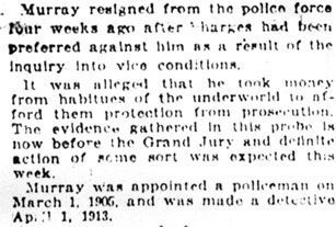 EVIDENCE Criminal prosecution of Detective George Murry and Policemen Tony Latorre, William Draper and Ira Hall for their alleged "protection" of vice in the downtown underworld loomed today. At a sensational hearing before the police committee of City Council last night it was unanimously decided to turn the mass of evidence against the four men, gathered by City Solicitor bleakly, over to Prosecutor Wolverton's office. At the hearing, Policeman Hall was summarily dismissed from the department, classed as a "moral degenerate" and roundly flayed when, after he acted as his own attorney, he was cross-questioned by every member of the police committee. Hall was the only one of the quartette of accused officers who made any attempt to defend himself. murry, Latorre and Draper resigned several days ago. At the police committee session last night it was the sense of the members that their resignations was a tacit admission of guilt and that their mere removal from the police department is not sufficient punishment for their underworld activities. The grand jury convened on Tuesday of this week. The next step will be the presentation of evidence gathered by Mr. Bleakly against the four men to the prosecutor's office who, in turn, will turn it over to the grand jury. Quick action may be expected, it was predicted today in official circles. Policeman Hall's friendship for Anthony Paradise, charged with peddling "dope", was brought out at last night's hearing. |