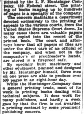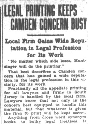 From the beginning the business was on a sound and growing basis, and by 1915 it was necessary to move into greatly enlarged quarters. In 1916 it was incorporated with Irwin F. Huntzinger as president, B. C. Burroughs, secretary and treasurer, Herbert Richardson, solicitor, and Joseph M. Daugherty, general manager. Mr. Huntzinger began specializing in appellate printing very shortly after he started the business and is widely known as "the Appellate Printer" because his facilities for handling this sort of printing bring him the business of over five hundred Philadelphia lawyers, to say nothing of hundreds of others from all over South Jersey and even neighboring States. He attributes his success in this line to the fact that he has special methods of handling appellate printing, whereby two men in his plant can do as much work in eight hours as twelve men in any other plant could do in the same amount of time. Mr. Huntzinger is a member of the Camden Chamber of Commerce, is former treasurer of the Automotive Collateral Company of Camden, and fraternally is affiliated with Lodge No. 293, Benevolent and Protective Order of Elks.