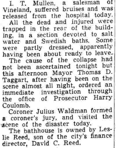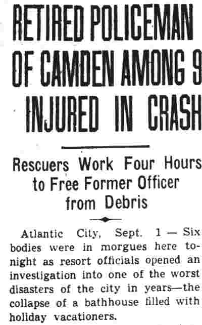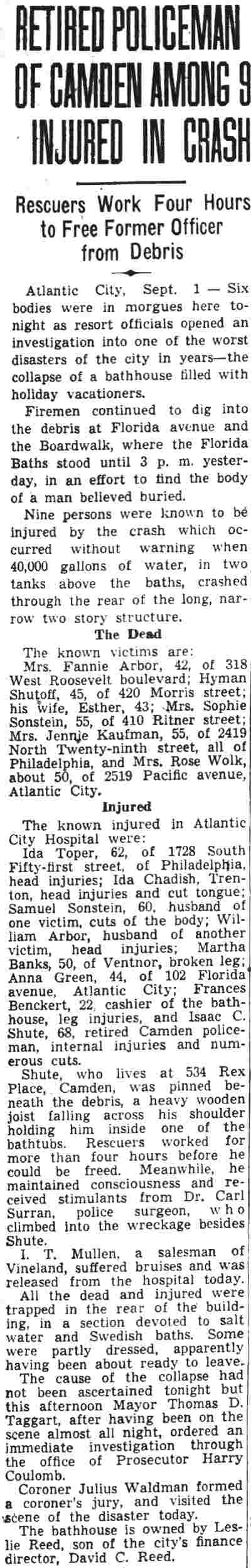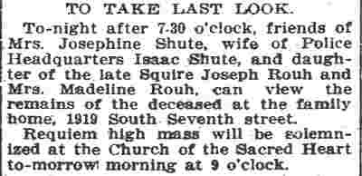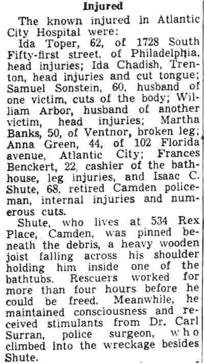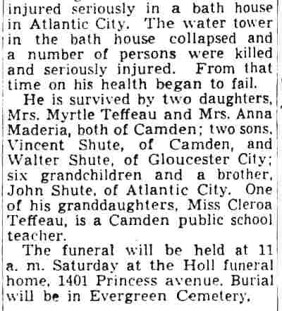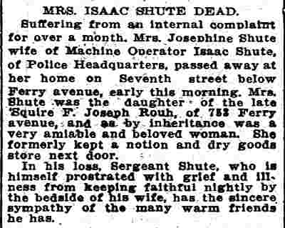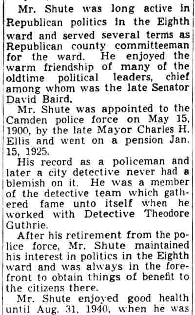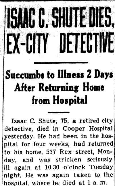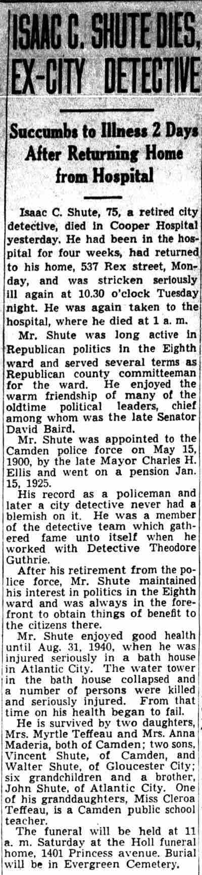 ISAAC CLARK SHUTE JR. was born on May 18, 1867 to Isaac C. Shute and the former Sarah Jane Fox. His gather was a locomotive engineer. The family lived in Camden's North Ward when the 1870 Census was enumerated. The 1880 Census shows the Shute family at 611 Elm Street. The family consisted of Isaac C. Shute's parents, older siblings William F., and Mary J. Shute, and younger siblings Annie, Martha, John, George, and Frank Shute. Also at home was grandmother Mary Shute, 79. On October 20, 1888 Isaac C. Shute married Sarah W. "Sallie" Thomas at the Union Methodist Episcopal Church at South 5th and Mt. Vernon Streets in Camden. Her father was Benjamin H. Thomas Sr., a long-time Camden police office and Republican political figure in Camden's Eighth Ward. The Benjamin H. Thomas Sr. family's political activities were very much a family affair. His wife Rebecca was the sister ofJesse W. Pratt, who served as Mayor of Camden from 1896 to 1892. Benjamin H. Thomas Sr.'s son, James Thomas, married Madeline Rouh, daughter of Eighth Ward Justice of the Peace F. Joseph Rouh. Isaac and Sallie Shute lived with her parents, the Thomases, at 697 Ferry Avenue. Benjamin H. Thomas Sr. passed away from "brain fever" on November 23, 1893. Isaac and Sallie Shute continued to reside at 697 Ferry Avenue until her untimely death in 1898. Isaac C. Shute remained at 697 Ferry Avenue until at least 1905. Following his late father-in-law into law enforcement, Isaac C. Shute was appointed to the Camden Police Department on May 15, 1900, and served with distinction until retiring on pension in January of 1925. On February 9, 1908 Isaac Shute married a widow, Mrs. M. Josephine Rouh Schmidt, the daughter of Justice of the Peace F. Joseph Rouh, and the sister-in-law of his late wife. They lived at 755 Ferry Avenue until 1912. The 1913 City Directory places them at 1915 South 7th Street, and the 1914, 1915 and 1916 Directories has them at 1909 South 7th Street. Sadly, Mrs. Shute passed away on May 25, 1915. Isaac C. Shute is not listed in the 1917 Directory. By the fall of 1918, he had moved to 1826 South 6th Street. After leaving the Camden Police Department, Isaac C. Shute remained active in Eighth Ward politics for a number of years. By August of 1940 he had moved to 534 Rex Place. He was seriously injured in Atlantic City on August 31, 1940 when the water tower on the roof of a bath house collapsed. He passed away on July 8, 1942 and was buried at Arlington Cemetery, next to his first wife. |