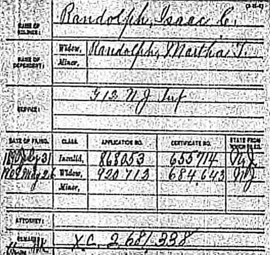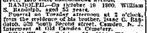 Isaac C. Randolph was born in New Jersey in January of 1843 to Edward E. and Rebecca P. Randolph. The family, which included younger brother William, was living in Camden's South Ward when the 1850 Census was taken. Edward E. Randolph was working as a house carpenter. The family was still in the South Ward at the time of the 1860 Census. Isaac Randolph was working as an apprentice hatter. Isaac C. Randolph enlisted in Company G, 12th New Jersey Infantry Regiment on September 4, 1862. The Twelfth New Jersey Infantry was commanded by Colonels Robert C. Johnson, J. Howard Willetts, and John Willian during its term of service. This regiment was raised under the second call of the president for 300,000 men, Robert C. Johnson, of Salem, formerly major of the Fourth regiment (3 months' men), being commissioned as colonel early in July, 1862. Woodbury, Gloucester county, was selected as the rendezvous, and on July 25 the first detachment of troops, about 950 men, was mustered into the U. S. service. Many of the officers had already seen service in other regiments, but comparatively few of the men were familiar with military duties or requirements, though all entered cheerfully upon the work of preparing for the duties before them. On September 7, 1862 the regiment left the state for Washington, but at Baltimore was diverted from its course by Gen. Wool, commanding that district, who ordered it to proceed to Ellicott City, the county seat of Howard County, Maryland, 15 miles from Baltimore on the line of the Baltimore & Ohio railroad. At Chancellorsville, on May 3, 1863, the regiment received its first taste of actual warfare. It behaved with great gallantry, though the loss was severe, amounting to 179 in killed, wounded and missing. Although under arms during the two succeeding days and nights, it was not again engaged, and on the night of the 5th it re-crossed the Rappahannock and proceeded to its old camp, having in its first battle lost over one-tenth of its men. Soon after reaching the field at Gettysburg on July 2, Company I was sent out on the skirmish line, but the combat not yet being opened, only two or three casualties were sustained. In the afternoon a house and barn standing about 200 yards west of the Emmitsburg road and nearly equidistant from either army having been occupied as a cover by the Confederate sharpshooters, Companies B, H, E and G were sent out to dislodge them, which they did, capturing 6 commissioned officers and 80 men, but with considerable loss, Captain Horsfall of Company E, a brave officer, being killed, and Lieutenant Eastwick wounded. During the fearful infantry contest of the following day the regiment was actively engaged, but only lost 5 or 6 men killed and 1 officer and 30 men wounded. On October 14, when near Auburn mills, some 2 miles east of Warrenton, the Confederate cavalry made an attack upon the corps of which the regiment was a part, evidently hoping to capture its train, but they were repulsed with loss and the corps continued its retreat toward Centerville, the point which Lee was straining every nerve to reach in advance of the Union troops. In the engagement at Bristoe Station, which lasted for 3 or 4 hours, several men of the Twelfth were wounded, Lieutenant Lowe, of Company G, being among the number. In the skirmishes at Mine Run the regiment did not sustain any casualties, although under fire on several occasions. In the affair at Morton's Ford, some 10 men of the regiment were wounded, but only 1 fatally. At the battle of the Wilderness, although not engaged as a whole, the regiment suffered considerably, Lieutenant John M. Fogg, of Company H, being killed, while Lieutenant Frank M. Riley, of Company K, and several others were wounded. Two days later the regiment lost heavily, Lieutenant Colonel Davis and Captains Chew and Potter being among the wounded. In the magnificent assault at Spottsylvania, which resulted in the capture of over 3,000 prisoners and some 30 guns, the Twelfth again suffered severely, Lieutenant Colonel Davis being instantly killed while bravely leading the regiment; Captain H. M. Brooks and Lieutenant E. P. Phipps were severely wounded and were obliged to quit the service in consequence. In the assault at Cold Harbor the loss of the regiment was severe, Captain McCoomb, commanding the regiment, being mortally wounded by the explosion of a shell, which also killed or wounded several privates. Up to June 16 the total loss of the regiment in this memorable campaign had been some 250 killed, wounded or missing- a large proportion of the wounded being officers. From this time forward the regiment was in position at various points on the line, and in July it participated in the movement and affair at Strawberry Plains and Deep Bottom, on the north side of the James. Thence, by a forced march, it returned to the Petersburg front, arriving in time to support the assault at the explosion of the mine, July 30, though not actually engaged. It participated in the second movement to Deep Bottom, charging the enemy's picket line under Captains Chew and Acton, and upon returning marched to the extreme left flank of the Army of the Potomac, whence it was marched to Reams' Station, on the Weldon railroad, where the 1st division of the corps had preceded it. In the severe action at the latter place Lieutenant Colonel Thompson, commanding the regiment, was severely wounded and Lieutenants Rich and Stratton were killed. After the action at Reams' station the regiment was in various positions along the Petersburg front, Fort Hell on the Jerusalem plank road, Fort Morton, and at other points, until late in October, when it moved out and participated in the action known as the battle of the Boydton road, where it lost 4 killed and 9 wounded, including Captain T. O. Slater. In the winter of 1864-65 it took part in the various actions at Hatcher's Run, where in one instance it charged across the run, waist deep, and took the enemy's works, up
