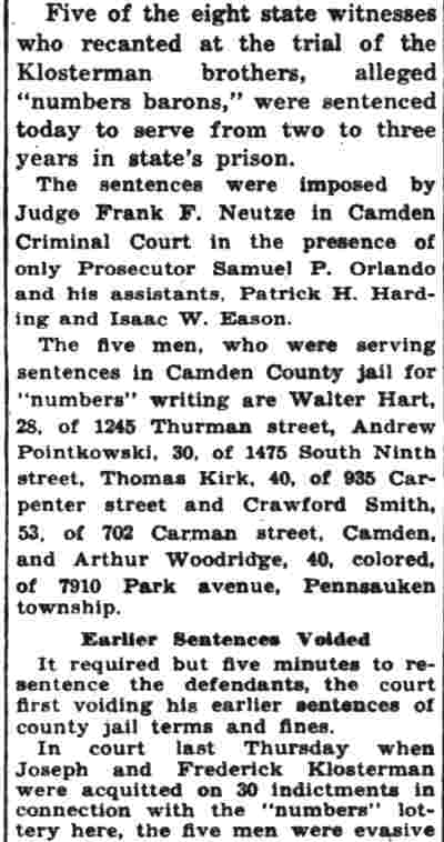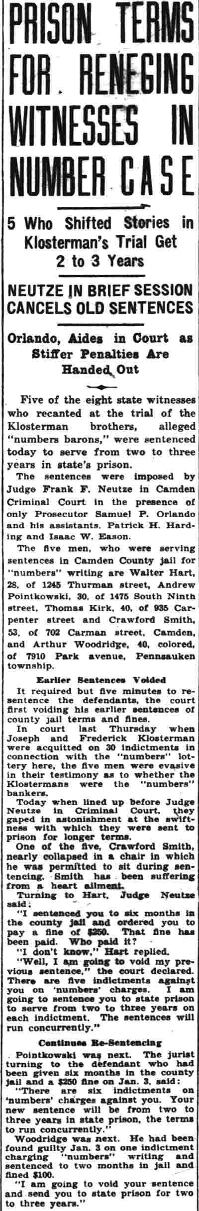 SET TODAY IN GAMBLING DEATH Jury List Prepared for Coroner's Action in Holdup Fatality The coroner's inquest to decide the cause of death to Angelos Magalas, Greek chef, who was shot during a card game holdup at 725 Penn Street on January 11, will be held today at 10 a. m. Coroner Franklin P. Jackson III, of Collingswood, will conduct the inquest and will select his jury of 12 from a list of 15 persons prepared by the office of County Prosecutor Samuel P. Orlando. Detectives already have subpoenaed 20 witnesses for questioning at the inquest, including players who were the victims in the holdup and three Camden physicians who attended Magalas prior to his death. The witnesses will include Samuel and Mabel Ermilios, tenants of the Penn Street house where the holdup occurred; George and Annette Mastros, who room at the house; Samuel Bosco, broadway barber; George Summers, Ross Pantel, Michael D' Andrea. and William Caras, who according to police were participants in the card game. All of the men were held as material witnesses in the shooting when arraigned today before Police Judge Gene R. Mariano. Doctors to Testify Other witnesses will include Dr. Paul Mecray, Dr. A. S. Ross and Dr. Edwin R. Ristine and Miss Sophia MacAfee, a Cooper Hospital nurse. Police who will testify include Detectives Thomas Murphy, harry kyler and William Boettcher and Patrolmen Richard Powers, Frank Clements, George Nicktern and Sergeant Jack Deith. The jury will be selected from Guy Clokey, Collingswood; Lawrence Ball, Haddonfield; Howard Friant, Collingswood; Harry Chew, Collingswood; Sig Schoenagle, Camden merchant; Raymond Hanly, real estate broker; Benjamin Brest, Raymond Worrel, John Eby, all of Camden; William H. Lorigan, Merchantville; David B. Robinson, Collingswood; Rev. James Pemberton and John McGowan, of Camden, Earl Jackson, of Collingswood and Morris B. Clark, of Haddonfield. Coroner Jackson refused to give a certificate of death until the chemical test of Magalas' brain was made by Philadelphia experts. The re suit will not be revealed until the inquest. Assistant Prosecutor Isaac Eason and County Physician David S. Rhone gave it as their opinion that Malagas died of natural causes rather than, the bullet wound. Coroner Jackson then ordered an inquest to be held. Police are searching for Frank Luggi, 21, of 322 Penn Street, who they say was one of the holdup bandits and the one who fired the bullet that struck Magalas. The last coroner's inquest held in Camden county was in 1933, in the death of Thomas Timothy Sullivan, and previous to that none had been held here in 25 years. Sullivan was 57 years old and lived at 401 State Street. He was employed as a detective by the Pennsylvania Railroad. He was found shot to death in a shack in the rail road yards on August 28, 1933. At that time, County Physician Edward B. Rogers issued a certificate of death that Sullivan had committed suicide. The decision of the county physician enraged members of Sullivan's family and they demanded an inquest. The inquest was ordered by then Coroner Arthur H. Holl, who presided. All the evidence in the case was presented to the jury of 12 men, and after deliberating for less than an hour, they returned a verdict that Sullivan had been murdered by persons unknown. Under state law, the county physician may order an inquest; with 12 persons on the jury of the coroner's choosing. The jurymen may be taken from the present panel of the petit jury or be picked at ran dom. The Grand Jury does not have to indict on the basis of the inquest. At the inquest Coroner Jackson will be assisted by attaches of the prosecutor's office. Malagas, the father of three children, lived at 1110 Langham Avenue. He was shot when several armed bandits held up a card game and he died several days later. |