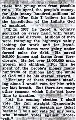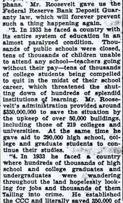 OF G.O.P. FLAYED BY FRENCH Directing questions at David Baird, Republican candidate for governor, Samuel T. French, former president of the New Jersey Bridge and Tunnel Commission, last night attacked the sincerity of Baird's campaign speeches. French addressed more than 200 voters at the headquarters, of the Woodrow Wilson Democratic Club, Atlantic and Louis Streets, in appealing for suffrage in the interest of A. Harry Moore, Democratic gubernatorial candidate. "In a campaign speech at. Plainfield on October 17," French said, "Baird pledged himself to quick relief of the tax burden. In view of past events, I do not know what has come over Mr. Baird; I do not know what has changed his heart. He was a director of Public Service and the controlling power of the legislature when the legislature passed a bill, which relieved the Public Service of keeping the roadways and street surfaces in good condition between the rails on eighteen inches of either side. This resulted in a saving of millions of dollars to Public Service and put the bill in the hands of the taxpayers. Yet, Mr. Baird says conditions must be changed by a change of the taxation system. Is that the way to change taxation- by increasing it for the citizens and lowering it for the corporations? Asks Seven Questions "If Camden County is where Mr. Baird derived inspiration for his Plainfield speech, I ask him to publicly answer these questions: "First, what was the idea of buying the ground upon a portion of which is erected the county court house and city hall, when the city owned a plot of land much better lo-cated on which it would have been unnecessary to destroy property, which was paying into the city treasury annually approximately $70,000 in taxes? "Secondly, why was it necessary to buy that whole tract of land and destroy all the tax producing property when the city only had use for less than 25 percent of it? "Thirdly, from whom did the city purchase a large portion of this tract? Why was it necessary to build a city hall at the particular time? What was the total cost of the city hall and court house annex? And, of utmost importance, why was the contract price paid in full on or about December 1, 1930, when the work was only about 80 percent completed? "Fourth, did Senator Baird approve of all the acts of the City Commission and the Board of Freeholders in the city's and county's activities in the purchase of all the land and the erection of the building? "Fifth, if Mr. Baird's answer is 'yes,' to that question, then I ask him why were former Mayor Price and Commissioner T. Yorke Smith, dropped from the Republican ticket in the municipal election? If Mr. Baird's answer is 'no,' then I ask him why were not the entire five commissioners dropped from the Republican ticket at the last municipal election, instead of making Price and Smith the goats? “Sixth, I ask Mr. Baird if he offered objection to the selection of the site or the expenditures in connection with the enterprise? "Seventh. I ask the Republican candidate for governor, believing as he says he does in his Plainfield speech that the spending orgy must stop: What would have been the saving to the taxpayers of Camden city and county if the new city hall had been erected at the Civic Centre instead of its present location?" Praises Moore's Record. French lauded the record of A. Harry Moore, the Democratic candidate for governor, and charged the Republican state administration with "wanton expenditure and gross extravagance of the first water." "Property will be led to the point of confiscation if the Republicans are allowed to continue their orgy of spending." French concluded, "and the only remedy in election of Moore with a Democratic legislature to support him." Thomas Madden also spoke at the meeting. Democratic rallies were also held last night in three wards of the city and in Ashland. C. Lawrence Gregorio, former assistant prosecutor, and David L. Visor spoke at the First Ward Democratic Club, 315 North Second Street; Firmin Michel and Frank Connors at the Tenth Ward A. Harry Moore Club, 822 North Eighth Street; Albert Melnik, Gene Mariano and John Crean, at the Ninth Ward Democratic Club, 543 Washington Street, and Isaac Eason, former assistant attorney general of the United States at the A. Harry Moore Club of Ashland, Burnt Mill Road. |