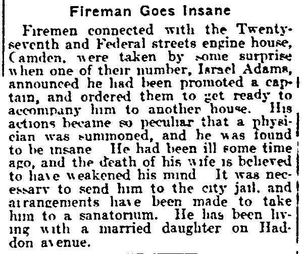 ISRAEL BUTLER ADAMS JR. was born on October 23, 1859, one of twelve children born to Israel and Adeline Cox Adams. The elder Adams was a farmer. By the spring of 1860 the family was living in Camden County's Stockton Township, quite possibly in or near the Delair section of what is now Pennsauken. His father passed away in Delair in 1886. Pennsauken was incorporated in 1892, what remained of Stockton became part of Camden in 1899. The 1896 Camden City Directory shows Israel Adams running a bar and living at 703 Federal Street. The Directory for 1897 shows him in the same line of work and residence, at 1916 Federal Street. The following year he is listed at 1524 Federal Street and operating stables near 18th and Federal Street. He was still living at 1524 Federal Street when the 1899 City Directory was compiled, then working as a salesman. The 1900 Census shows Israel Adams was a widower, living at 1526 Federal Street with his son Durbin, daughter Adeline, and widowed mother. Israel Adams was then working as an express driver. Israel Adams remained in East Camden in the 1900s and into the 1910s. By 1906 he was living at 5 North 30th Street and working for the City of Camden as a fire fighter. The 1910-1911 directory shows him at 42 North 34th Street. The 1912-1913 Directory lists him at 3302 Rosedale Avenue. At some point in his career Israel Adams was promoted to Lieutenant and was serving at the East Camden firehouse, North 27th Street and Federal Street, in 1916. Israel Adams suffered a nervous breakdown while on the job on August 29, 1916. He was let go from the Department on December 1, 1916, and was replaced by Charles Fitzsimmons IV on December 1, 1916. Israel Adams died in 1917 . |