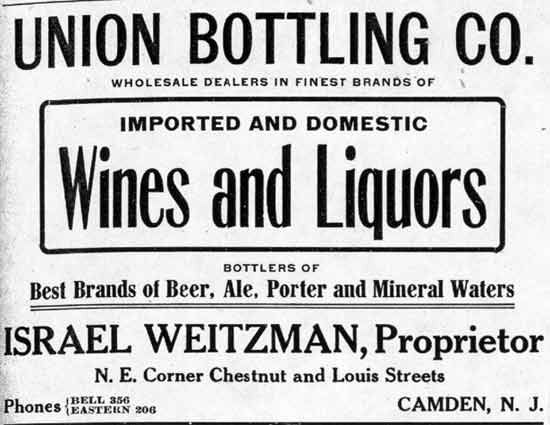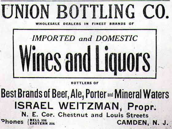 ISRAEL WEITZMAN was born in Eastern Europe around 1872. After coming to the United States he lived in Pennsylvania for a while in the 1890s, where daughter Lillian and son David were born. The Weitzman family moved to New Jersey shortly after the 1900 Census was enumerated, and a third child, Harry was born here. A fourth child, Arthur, was born shortly after the census was taken in 1910. A fifth child, Edward, died in a drowning accident at the age of 13. Sometime after September 1903 Israel Weitzman acquired the property at 1195 Chestnut Street in Camden from Anton Lukaszewski. Israel Weitzman and his wife lived and did business at 1195 Chestnut Street, the corner of Louis and Chestnut Street. He was engaged in the wholesale distribution of imported and domestic wines, liquors, beer and other beverages. He also bottled his own line of soft drinks. At home were the Weitzman's three children, Lillian, David, and Harry. Their neighbors in those years included the John L. Wojtkowiak family, at 1210 and 1212 Chestnut. John L. Wojtkowiak was one of the founding members of the predominantly Polish St. Joseph’s Roman Catholic Church, located at South 10th and Mechanic Streets. One of his sons, also named John Wojtkowiak, was killed in action during World war I. Another son, Stanley Wojtkowiak, founded the Stanley Heat & Fuel Company which operated in Camden for many years. When Prohibition was enacted in 1919 Israel Weitzman ventured into real estate. By January of 1920 the family had moved to 1201 Chestnut Street, just across the street from their previous abode. During the 1920s the family moved to the Parkside section of Camden, and bought a fine home at 1530 Baird Boulevard. 1195 Chestnut had been sold during the 1910s to Frank Wozniak, who ran a tavern there. His son, Walter L. Wozniak and his wife carried the trade on into the 1970s, the bar then being known as the Boulevard Inn. Israel Weitzman was active in civic and religious affairs during the 1920s. He was a founding member of Congregation Beth El, and was a member of the Camden County Historical Society, with a special interest in Jewish history. The stock market crash and ensuing economic depression cost Israel Weitzman most of his fortune, but he did not declare bankruptcy and insisted on paying off his creditors. At the end of Prohibition, Israel Weitzman's son Arthur purchased one of the first liquor licenses available in New Jersey and opened up a new liquor store at 136 North Broadway, at the corner of Broadway and Cooper Street in the then relatively new Wilson Building. This of course was then and still is a very desirable location, made more so in those years by the presence across the street of the Walt Whitman Hotel. Israel Weitzman passed in 1934. He is listed in the New Jersey Bell Telephone Directory for 1936, however. The 1947 Camden City Directory lists his wife Sarah as a widow. Sons David and Arthur were carrying on the business in that year. The Weitzman Liquor Store remained open in Camden until well into the 1980s. The store never had anther tenant, and still can be seen in 2004 is the sign for what was for decades one of Camden's most popular liquor outlets. |