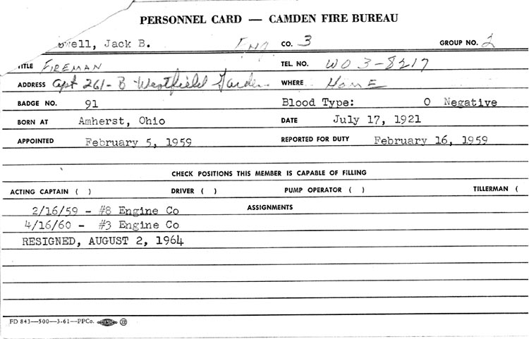 JACK BRITTON BOWELL was born in Amherst, Ohio on July 17, 1921 to Lloyd F. Bowell and his wife, the former Elizabeth Berry. His father had served in the United States Army as a Second Lieutenant during World War I. Jack Bowell was the oldest of three brothers, coming before Lloyd Jr. and Robert. The Bowell family had moved from Ohio shortly before the birth of Robert Bowell in 1923 to Philadelphia, Pennsylvania, and in time to Camden. Sadly, Lloyd Bowell Sr. passed away on November 5, 1934 and he was buried at Philadelphia National Cemetery. Lloyd Bowell Sr. was not living with his family when the census was taken in April of 1930, this may have been for any number of reasons including illness. When the 1940 City Directory was compiled the family was living at 639 North 8th Street in North Camden. Jack Bowell was working at the RCA-Victor factory as machine operators, and Lloyd Bowell Jr. also worked there, as a gluer. Jack Britton Bowell enlisted in the United States Army on October 16, 1940. His brother Lloyd Jr., younger by a year, enlisted three days later. It appears that Jack Bowell was initially scheduled to go to the Philippines, this, however may not have happened, as the National Archives have no record of him as a prisoner of war, the fate of virtually all of the American military personnel stationed in the Philippines who were not killed during the Japanese invasion. Lloyd Bowell's enlistment was for the Panama Canal Zone. Younger brother Robert was drafted in October of 1943 for the Army Air Corps. Jack Bowell reached the rank of Corporal before being discharged from the Army. The 1947 Camden City Directory reveals that Jack Bowell had returned to Camden, and that his father had passed away. He lived with his mother, brothers Lloyd Jr. and Robert at 639 North 8th Street in North Camden. Mrs. Bowell is listed at that address in the 1959 New Jersey Bell Telephone Directory. Jack Bowell is known to have lived at apartment 261-B of the Westfield Gardens Apartments on Westfield Avenue in East Camden during his tenure with the Camden Fire Department. On February 16, 1959 Jack B. Bowell was appointed to the Camden Fire Department. He reported for duty with Engine Company 8 on Kaighn Avenue that day. On April 16, 1960 Jack Bowell was transferred to Engine Company 3. He resigned from his position with the Camden Fire Department on August 2, 1964. Jack B. Bowell later moved to St. Paul Minnesota. He died on March 27, 2008 and was buried at Fort Snelling National Cemetery in South Minneapolis, Minnesota. |