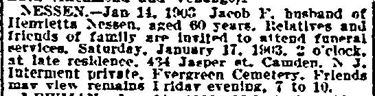 JACOB F. NESSEN was born in Pennsylvania in September of 1842 to Peter W. and Hannah Nessen. His father,who had been born in Denmark, worked as a Philadelphia policemen when the Census was taken in 1850.