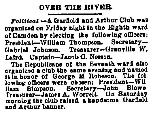 held substantially the The Fourth New Jersey then took part in the siege at Petersburg, engaging Confederate troops on January 6, 1865. Jacob F. Nesson was promoted to Full Sergeant after this action. The regiment fought again at Petersburg in April of 1865. After Lee's surrender the regiment was assigned to what was known as the provisional corps, Army of the Potomac. Jacob F. Nesson was again promoted, to First Sergeant, on May 1, 1865. The Fourth New Jersey Infantry Regimnent mustered out on July 9, 1865. The total strength of the regiment was 2,036, and it lost during service 29 by resignation, 319 by discharge, 83 by promotion, 81 by transfer, 257 by death, 372 by desertion, 3 by dismissal, 109 not accounted for, mustered out 783. First Sergeant Nessen was among those who mustered out at Hall's Hill. Jacob Nessen came to Camden after completing his military service. The Census of 1870, taken in August of that year, shows Jacob Nessen, his 20 year-old wife Henrietta, and 5 month-old son William living in Newton Township. Jacob Nessen was the working as an iron moulder at one of the nearby foundries. Newton Township was annexed to Camden shortly after the census was taken, forming the Seventh and Eight Wards of Camden. Jacob Nessen became active in Republican politics in the Eighth Ward, where he lived. When the 1878-1879 City Directory was compiled, Jacob Nessen was living at 428 Jasper Street, working as a constable. The 1880 Census shows his living at 428 Jasper Street with his wife, widowed mother Hannah, and children Jacob F. Jr., Mary, and George W. Nessen. By 1900 the Nessens had 10 children, but only five were still living. Jacob Nessen was working as a laborer when the Census was taken. He worked as a laborer and as an iron moulder at the Gloucester Foundry in nearby Gloucester City during the early and mid-1880s. He also stayed active in local politics. When Samuel S. Elfreth returned as Chief of the Camden Fire Department in 1885, Jacob Nessen was appointed to the department as a stoker with Engine Company Number 1. He was still active with the Department in 1886. In 1886 the Camden Steam Fire Engine Company Number 1 was located at 409 Pine Street in a three story 20 by 90 foot brick building (the old Independence Fire Company No. 3 engine house). The company's apparatus was an Amoskeag second class steamer (maker's plate 6318) drawn by two horses and one Silsby two wheel hose cart drawn by a single horse. The company was equipped with 1000 feet of good hose, axes, lamps, etc. The company roster included John Stockton, Foreman; G. Rudolph Tenner, Engineer; William Deno, driver; William W. Laird, stoker; Wilson Bromley and jacob f nessen, hosemen. call men were William Deith, andrew miller and William Bogia. Bromley and Bogia would later suffer line of duty deaths.. By the spring of 1887 Jacob Nessen had been appointed to the Camden Police Department. He was still living at 428 Jasper Street at that time. Jacob Nessen served with the Camden Police for three years. By the end of 1890 he had moved to 434 Jasper Street and had gone back to work as a moulder. He was still living at 434 Jasper Street when the Census was taken in 1900. The Census shows Jacob and Henrietta Nessen living with three of their five living children, George, Emma, and Raymond. Their neighbors at 424 Jasper Street were Camden firefighter Lewis Buzine and family. To his last day a resident of 434 Jasper Street, Jacob F. Nessen passed away on January 14, 1903. He was buried at Evergreen Cemetery. |