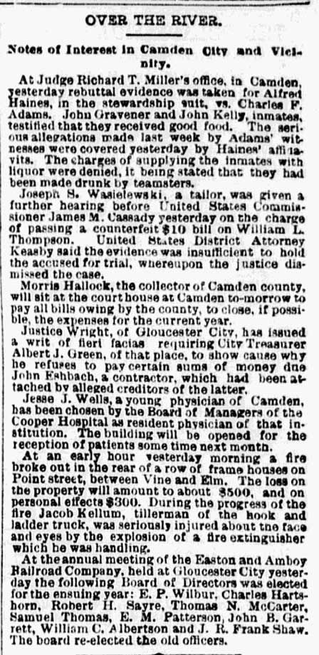 A False Alarm of Long Ago THERE were two alarms of fire Saturday evening, one at Fourth and Hamilton streets at 8:29 o'clock, and another at the West Jersey Ferry, an hour later. People in the vicinity of the first-named place turned out to look at the machines propelled at lightning speed by snorting equines, and wondered what it was all about; and some of them thought the wide-awake fire boys were beside themselves, as they asked, for the particular house, in the neighborhood of box 24 upon which, with steam up, their apparatus was able to put on, the water. The firemen and people were quietly informed by a party that drove away in a barouche that it was a designed deception. Under date of October 6, 1879, that was the introduction to a two-column story under a display headline. But, it was, a single line-"False Alarms." Readers of the period must have been as much mystified as were the firemen and citizens mentioned in the article, for it was not until more than half a column had been devoted to that incident that the public was let into the great secret. It was a test of the first fire alarm system introduced into Camden. Interest in that incident is revived by the city commissioners last week entering into a contract with that same concern to install in the new City Hall a system for somewhat more than $51,000. That first "system" cost the city $2000 but it was a big sum then and just about 10 times more space was devoted to it in the old Post than in the Courier-Post last Thursday week. Paid Department 10 Years Old Camden's paid fire department in 1879 was just 10 years old. It already was winning approval of even the recalcitrants, who had asserted back in 1869, that the old volunteer companies would certainly be missed; that the "professionals" would not have as much interest in putting out a fire as the boys who ran with the Perseverance, the Weccacoe and other organizations, usually bitter rivals. Not infrequently the volunteers battled over hooking up their hose while the fire burned, a event by no means outgrown since that occasionally happens even now, as files of the newspapers prove. But on that Saturday night 54 years ago, it developed that those who drove away in the mysterious barouche were J. W. Morgan, Crawford Miller and F. P. Pfeiffer; fire commissioners of city council, along with R. S. Bender and Thomas Beatty. They were but carrying out orders to see that the system worked and it was John T. Bottomley who issued those orders. He was Camden's big mill owner but more to the purpose in that particular incident, president of city Council. He had approved the fire alarm system but did not intend putting his O. K. on that $2000 bill until he had seen it in practical operation. So unknown to the firemen, and the citizens as well, it was determined to test that system by way of turning in the alarms. So an alarm was pulled at 8.29 and "Bart" Bonsall, son of Henry L. Bonsall, publisher of the Post, narrates, in just 15 seconds flat the bell was sounded at No.1 Engine House at Fourth and Pine Street s. In two minutes hose cart No. 1 went bounding out with Driver George Hunt at the reins, followed by ben cavanaugh and his faithful nag "jim" with cart No. 2. Then came jake kellum and William Davis with the engine No. 2 drawn by "Dolly" in 2.45. After that was engine No.1 driven by edmund shaw and the horse "alec," coming along in 3 minutes and 5 seconds. It was explained Shaw was held up by the sandy roadway at Fourth and line . Spectacular Sight Anyhow, it must have been a great sight for the old-time families who then resided along the Middle Ward Streets as the racing steeds bounded over Fourth Street, then into third over a mighty bumpy roadway. But they arrived and vainly sought the blaze. It was while they were hunting that the barouche came along and the commissioners let them into the great secret. "Bart" doesn't relate what the firemen said about the false alarm, but, like as not the heat of their expressions was a good substitution for the fire they failed to find. The system was one of those nine-day wonders that had the town on its toes. Everybody listened for the alarms in those days, for when they were sent in the bells in the fire houses pealed the number of the box. The strokes could be heard surprisingly far. Since there were but 11 boxes it was not long before many knew just where the fire was located and made a bee line for the scene. Old volunteers, particularly, never quite lost their interest in fires and, whenever they heard the alarm, hot footed it to the scene of excitement. That was all right when Camden was little more than a village, but as the community grew it became a serious proposition, since the racing citizens often interfered with the firemen. Thus about 30 years ago the fire bells were silenced. Now none know of an alarm coming in save the various houses and the Courier-Post which has a wire attached from headquarters bringing in the alarms so that reporters and cameramen may get on the scene quickly as possible. O rdinarily, little thought is given to the need for instant and accurate sounding of an alarm made possible through the expert work of City Electrician Jim Howell and his aides. If it were not for that perfection and the speed with which friend reach the scene the losses would he large. And the insurance companies would be around with a "pink slip" as they were some 20 years ago. That meant a 25 percent addition to fire rates. Camden's motorized department plus the work of City Electrician John W. Kelly soon rid the city of that "slip." That system of long ago didn't include the cops. Now it takes in both departments, as it has done since the days of Chief Samuel Dodd, back in the early 90's. |