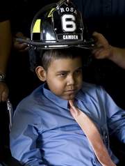 Deborah Hirsch CAMDEN — At age 9, Jacob Rosa knows, without a doubt, that he wants to be a firefighter when he grows up. He can't explain why, only that he's always loved the fire department. But he also understands that he may not live long enough to realize that dream, said his mother, Myrna Rubert.He was diagnosed with Hodgkin's Lymphoma in January 2006. Though Hodgkin's is one of a handful of highly curable cancers, a variety of medicines haven't been able to stop the disease from spreading from one lymph node group to another in his neck, chest, stomach and liver. Dr. Leslie Kersun, his oncologist at The Children's Hospital of Philadelphia, said she's exhausted all the treatments that might have cured his disease. Jacob's battle with cancer touched Camden firefighter Pete Perez, who heard about the boy's love of firefighting through a friend of the family and came to meet him not long after he was diagnosed. Perez kept in touch with the boy, calling his mother at least once a month to see how he was doing. At first, it seemed as if Jacob would be among the 90 percent to 95 percent of Hodgkins patients who go on to live long, normal lives. He went into remission after seven months of treatment, even returning to Cooper's Poynt school for second grade. He loved school, especially playing basketball in gym class. But he relapsed in June 2008. Doctors tried a variety of treatments and nothing worked. Kersun said there's no way of knowing what caused the cancer or why Jacob's not responding to treatment. "His lymphoma is very stubborn," Kersun said. "What's impressive about him, he never complains. No matter what's happening with him I can pretty much always get him to get a smile on his face." Jacob's attitude also made an impression on Perez. He remembered visiting the boy in the hospital during one of his treatments. "He said, "I've been fighting, I'm going to keep fighting,' " Perez remembered. "That just showed a lot of character." Perez brought his colleagues from Engine 6 to meet Jacob. They took him for rides around the block on their truck and brought him T-shirts, hats and framed photographs. During the holidays, they dropped off toys and food baskets. "We were always praying for him hoping he would get better," Perez said. "I can never put myself in his mother or father's shoes." When Perez heard that Jacob wasn't doing well a few weeks ago, he said he talked to his co-workers to see what else they could do to recognize the boy's courage and bravery. "I didn't want to wait until it was too late," Perez said. They decided to make his dream come true. On Wednesday, they invited him to the downtown fire station to become inducted to the department as an honorary junior firefighter. Jacob raised his right hand as Capt. Agripino Figueroa recited the fireman's oath for him. "Once a firefighter, always a firefighter," Figueroa said. "We're here for you, Jacob." Calling Jacob the bravest person he knows, Perez presented him with a badge and helmet. "Today he's going to become a brother of many of us, so he'll have thousands of brothers praying for him," Perez said. "He's part of our family now." Deputy Chief Thomas Quinn said just as Jacob looks up to the firefighters, they look at him as a role model. "We think that we have the worst day and when you see Jacob's family our troubles are very trivial," he said. Jacob sat silently in his wheelchair as firefighters and family members fussed over his new helmet. Even though he barely spoke, Rubert said she could tell he was enjoying himself because his smile never wavered. He's always been quiet, she said, so much so that she has to constantly ask him whether he's doing OK. "He'll never tell us," she said. "He'd rather withstand pain." Jacob said he doesn't complain "because I don't like being in the hospital." "He's got some good willpower there," said his dad, Jose Rosa Sr. Rubert said she sometimes hears Jacob crying when he's alone. But he'll hide his pain, whether physical or emotional, so as not to worry his parents and three older brothers. "He tells me, "Mommy, don't worry, I'm going to fight,' " Rubert said. |