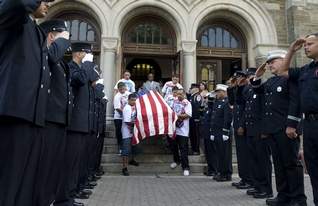 Members of the fire department carried his coffin, draped in an American flag, out of the church and others saluted as it passed.
