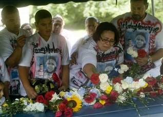 Myrna Rubert and Jose Rosa, mother and father of 9-year-old Jacob Rosa, place flowers on his coffin during Rosa's funeral at Arlington Cemetary in Pennsauken on Saturday. |