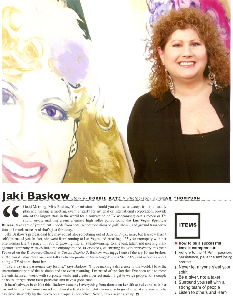Jaki Baskow's professional life may sound like something out of Mission Impossible, but Baskow hasn't self-destructed yet. In fact, she went from coming to Las Vegas and breaking a 25-year monopoly with her one-woman talent agency in 1976 to growing into an award-winning, total event, talent and meeting man-agement company with 28 full-time employees and 14 divisions, celebrating its 30th anniversary this year. Featured on the Discovery Channel in Casino Diaries 2, Baskow was tagged one of the top 10 star brokers in the world. Now there are even talks between producer Gina Gugolo (Just Shoot Me) and networks about doing a TV sitcom about her.