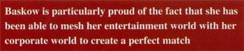 Baskow is particularly proud of the fact that she has been able to mesh her entertain-ment world with her corporate world to cre-ate a perfect match. Through doing so, she has been able to do her favorite thing in life: make someone's dream come true. Even for corporate meetings and conventions, she has been able to turn people from CEOs to employees into stars for a day.