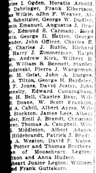 L. Ogden - Horatio Arnold Albert Dahringer - Frank Elbertson Thomas Wilkie - John F. Weaver Alfred A. Schnitzler - George W. Dudley Benjamin Emanuel - Augustus A. Drager Sr. Edmund S. Carmany - Boyd Lentz George R. Batten George ender Charles E. John Officer - Charles J. Ruhle Richard Finch - Harry J. Zimmerman Ralph Marengo - Andrew Kirk Wilbert B. William Bennett - Stanley W. Chudzinski Pierre J. Waegeman - William M. Geist John A Durges - Albert A. Tilton George H. Bardsley - Ernest F. Jones David Jester - John W. Connelly Edward Cunningham - William H. Bell Charles Baar - William H. Doane w. scott franklin - Edward Cahill Albert Ayres - William H. Stockton James Lees - Albert Kreder Emil J. Brandt - Christian Pommerer Thomas A. Campbell - William G. Middleton Albert Adams - George Hildebrandt Patrick J. Brady - A. Weston David P. Kates - Potter Thomas Brothers Clara Nixon - Anna Hudson Frank H. Guttkorn |