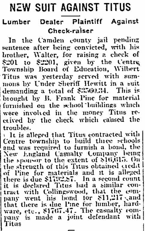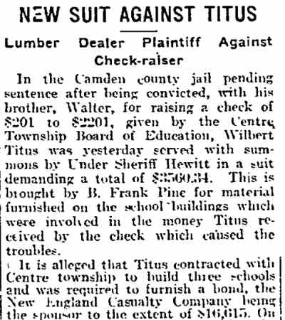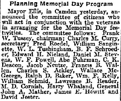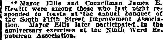 JAMES E. HEWITT was born in Camden NJ around 1864 to John K. and Hannah Hewitt. In 1880 the family was living at 439 Kaighn Avenue, John Hewitt supporting his family as a shoemaker. Living at the end of the block, at 463 Kaighn Avenue, was dry goods merchant Isaac C. Toone, who would go on to found one of Camden's first department Stores. James E. Hewitt had already gone into business, as a fruit dealer. He married his wife Carrie at the age of 21. By 1887 he was had a confectionary shop at 415 Kaighn Avenue, where he also lived. James E. Hewitt was a member of the Union Methodist Episcopal Church at the northwest corner of Mount Vernon Street and Newton Avenue. In 1909 he was appointed to the Official Board of the church. In January of 1920 the James E. Hewitt family owned a home at 529 South 5th Street. The family then consisted of James and Carrie Hewitt ant their fourteen year-old daughter Grace. James Hewitt was then serving as the Undersheriff of Camden County. He later served as the Director of Charities for the city of Camden, under the direction of Winfield S. Price, who served as Mayor of Camden from 1927 to 1931. He also at one time had served as President of Camden's City Council. Last a resident of 529 South 5th Street, James E. Hewitt died on May 20, 1935 of a heart ailment. |