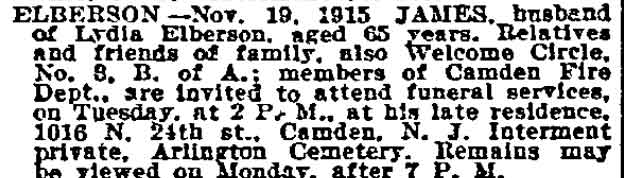 JAMES ELBERSON was born in Pennsylvania on October of 1851. The family name also comes up as Elverson and in at least once source Elbertson. James Elberson married around 1886. His wife Lydia gave birth to a son, Raymond Louis Elberson on January 7, 1892. James Elberson first appears in Camden City Directories in 1887, working as a bartender and living at 118 Elm Street in North Camden. He next appears in the 1891 edition, working as a carver and living at 619 North 2nd Street, where he stayed through 1896. During this time he was appointed to the Camden Fire Department. James