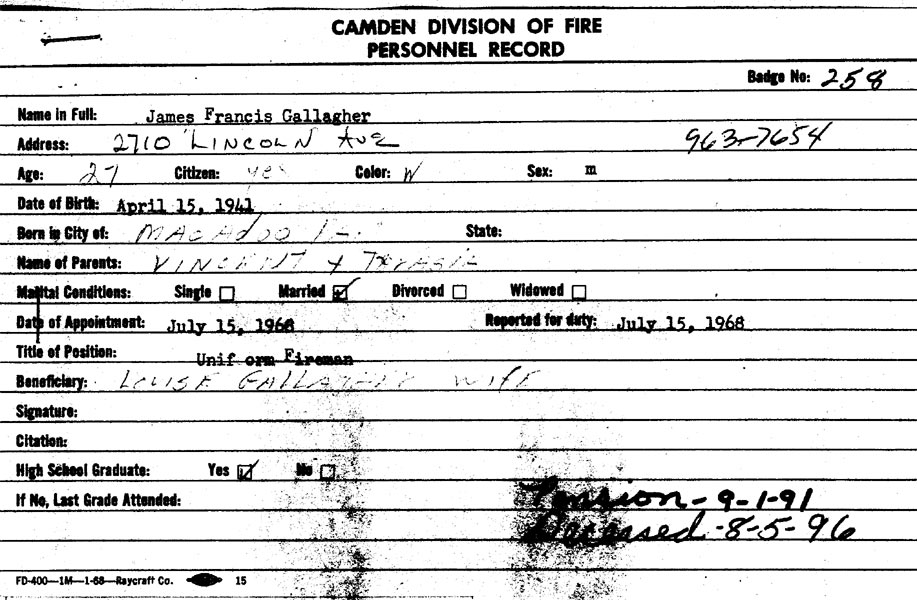 JAMES FRANCIS GALLAGHER was born April 15, 1941 to Vincent and Theresa Gallagher in Macadoo, Pennsylvania. The family was living at 1113 Louis Street when the 1947 Camden City Directory was compiled. Vincent Gallagher was then working as a mechanic. James F. Gallagher was appointed to the Camden Fire department on July 15, 1968 and reported for duty the same day. He made his home at 2710 Lincoln Avenue in Camden's Cramer Hill section with his wife Louise. James F. Gallagher retired on pension on September 1, 1991. He passed away on August 5, 1996. |