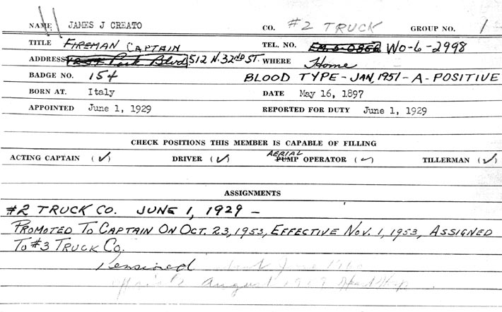 The 1929 Camden City Directory shows James Creato, city fireman, and his wife Caroline, living at 1629 Maryland Street. He had been appointed to the Camden Fire Department on June 1, 1929 and reported for duty the same day with Ladder Company 2 on Kaighn Avenue. The April 1930 Census shows that they had moved to 516 North 7th Street, and also that they had an adopted son, Robert, then 3 years of age. Fire Department records from 1931 show James Creato and family living at 1512 South 9th Street. At some point during the 1930s the Creatos moved to 832 North 3rd Street. Shortly after 7 A.M. on May 23, 1941, a Box was transmitted for a fire at west and clintonStreets, South Camden. Arriving companies found a three-story commercial building with fire roaring one hundred feet into the sky. A second alarm was transmitted on arrival, followed by third and fourth alarms ordered by Chief John Lennox. The building contained a food market on the ground floor and a clothing factory above. At the height of the blaze, Firemen clarence mcmullen and James Creato narrowly escaped with their lives after a burst of flame nearly enveloped them as they forced an interior door to a shaft. Both members fought their way out under the cover of hose streams directed by their comrades. Chief of Department Lennox and four firemen while at the far end of the blazing building on West Street, heard the shrill cries for help coming from a nearby dwelling. Racing into the home of Mrs. Elizabeth O'Hanlon at 423 clintonStreet, they found an excited albeit unscathed parrot, in a kitchen birdcage still crying for help. The bird was carried to safety by the firemen. The blaze was brought under control at 10:30 A.M. but not before heavily damaging the block long building. When the 1940 City Directory was being compiled, James J. Creato and family were living at 1327 Argus Road, and they were still at that address when the 1943 edition was being put together. The 1947 Camden City Directory shows James J. Creato, city fire fighter living at 910 north 8th street in North Camden. However, it also shows James and Caroline Creato operating Creato's Cafe at 202 South 5th Street, the corner of South 5th and Mickle Streets. It is unclear as to what the business arrangements were surrounding the operation of the bar, however, it should be noted that younger brother John Creato is listed as the bar's manager. James J. Creato was promoted to Captain on October 23, 1953 and sent to Engine Company 3 on Broadway. The 1956 New Jersey Bell Telephone Directory list his address as 512North 32nd Street in East Camden. By the fall of 1959 he had moved to Mt. Ephraim, New Jersey, according to the New Jersey Bell Telephone Directory. James J. Creato retired on pension in June of 1960. Last a resident of Mt. Ephraim, New Jersey, James Creato passed away in June of 1976. |
