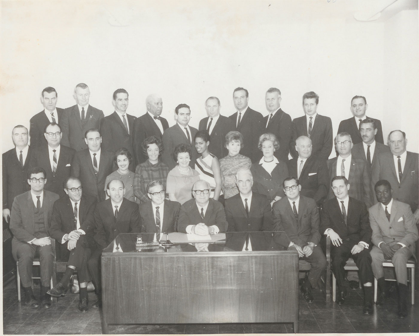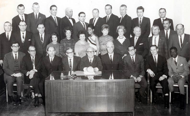 Front Row left to right: Frank Senatore, Willie Guidotti, Anthony Bezich, Pros. A.D. Bigley, Al Scarduzio, Dominick DiBart, Dominick Caruso, Isiah Steinberg. 2nd row (and those behind that row): Jerry Banks, Bill Eisenberg, Ed Kitlas, Harry Slattery, Harris Berman, Bill Reeves, Jerry Cohen, Tony DiMaggio, Capt Patrick Carr, Steve Robinson, Chief Bill Large, Sam Natal, Capt. James Large, Franz DeNie, Harry DeVore, Joe Carmen, Vince Wall, Fred Block, Louis Rodriguez, Bill Kelly, Estel Brown, Charles Cohen, Tom Mitchell, Tom Stuebing, Tom Schules 3rd Row (and those behind that row): Bob DePersia, Ginger Horner, Fran Conniff, Sue DiMaggio, Alice Palumbo, Doris Logan, Clare Sylvestro, Celia May, Caroline Migliaccio, Jo Sosa, Michele Thomas, Alice Adams, Mary Didio, Sue Weisenfeld, Virginia Roberts, Betty Greene, Charlene Dyer, Ira Back 4th Rowe: Jim Jackson, Joe Perry, Walt Haver, Leonard Dryer, Frank Werner, Bill O'Brien, Vic Sarubbi, Al Malloie, Charlie Weber, Joe Price. |