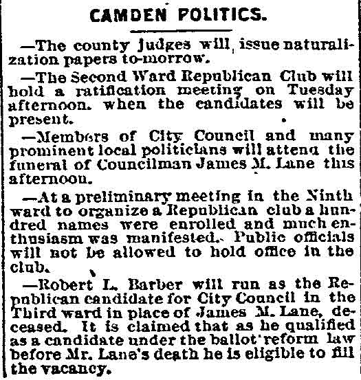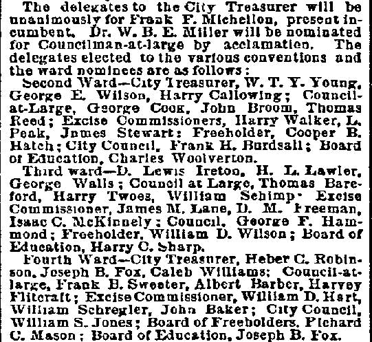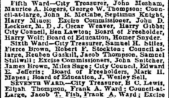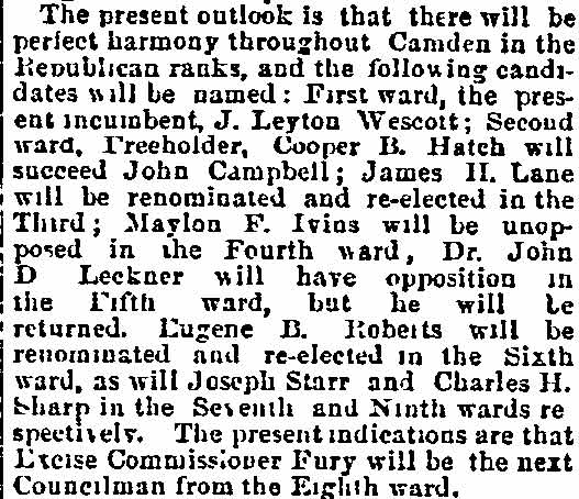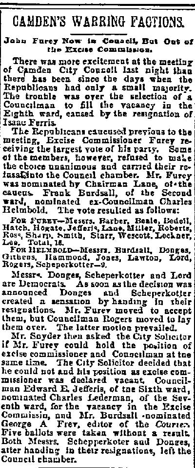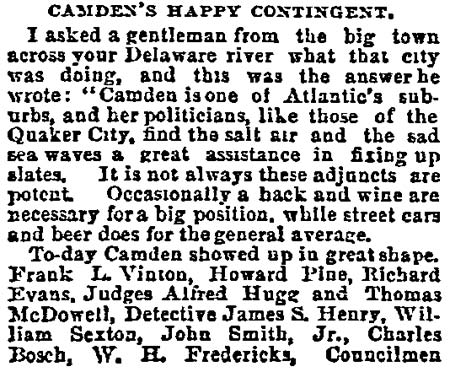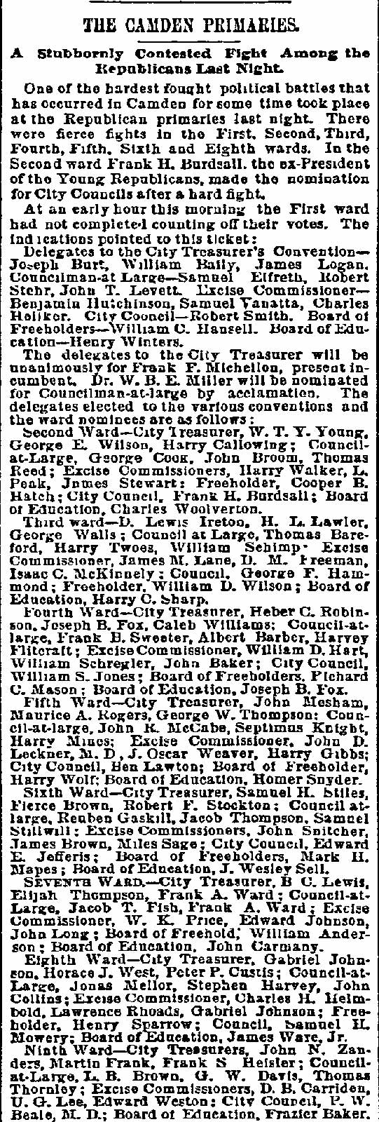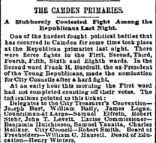 on By BEN COURTER Rival factions in the political conventions of long ago were more bitter toward one another than toward the common foe. So-called "rump" conventions were by no means exceptions. By "rump" was meant mereIy those who refused to play with the regulars and who set up the nominations, as did the Bull Moose on the national scale in the historic scrap of 1912 which resulted in the three-cornered battle of Wilson, Roosevelt and Taft, giving the Princeton professor the start that was to make him a world figure. Factions we still have, of course, and it is quite proper, since too much regularity often breeds party decay. But present-day political methods are certainly lacking in the spectacular rumpuses that stirred the rank and file in the period when delegates met and made their nominations. In a recent article allusion was made to the Democratic convention of September 20, 1878, when Nathan T. Stratton, of Millville, was nominated for Congress by the Democrats in the midst of downright fisticuffs, when "liar" and "hypocrite" and worse was hurled about the hall. Lest it may be assumed the party of Jefferson and Jackson only was given to such methods, it is fitting to give a picture on the other side of the political house. Dr. William H. Iszard's inexhaustible scrap book, loaned me by his son, former Assemblyman Iszard comes across with a copy of a tabloid political sheet, "The True Republican," which gives a recital of a battle royal in the G.O.P. ranks which will be of interest to some old-timers I know are still about. Rival Conventions That was the convention to nominate a sheriff called at Gloucester City Hall on Saturday, October 8, 1881, where we find the redoubtable Colonel James Matlack Scovel once more a moving factor, but this time in the ranks of the "regular Republicans" or at least so they called themselves as opposed to the "rump" set up by a rival group. Christopher J. Mines, long Fifth ward leader and later sheriff, apparently had been selected as temporary chairman with William A. Husted, who died last year well in his 70's, as secretary. But when that part of the delegation marched up to city hall, like the famed king's horses- they marched down again. As a matter of fact, not much marching was done in the hall- for it was asserted by the "true Republicans" that when they essayed to enter the portals they found Colonel Scovel and Henry M. Jewett, father of Harry Jewett, a Camden newspaperman of the long ago and for years later Jersey editor of the Inquirer, in command. More, it was charged "people representing the worst elements of society" were on guard and presented a phalanx which even the huskies of the opposing force could not break. Mines was strong-armed by the minions of Scovel and Jewett and there was so much hooting and yelling and cussin' that the "true" part of the outfit walked out, all 29 of them, over to Moss' hall where they proceeded to carryon their convention to their own taste. And all 29 of these valiant Republicans voted for Eli B. Morgan as their candidate for sheriff. You old timers will be interested in recalling these delegates who refused to kowtow to 'Colonel Jim.' In the Third ward there was James M. Lane, Charles S. Cotting and George Martin, in the Fourth, Husted, the Sixth, C. C. Smith, Thad Varney, Charles A. Sawyer; in the Seventh, Stephen Walters, Charles Lederman, William Simpson; in Gloucester, John W. Wright, David Anderson, Frank Mills, Robert Lafferty, Richard Allen, Jesse Daisey, Samuel Wood; in Haddon, Charles M. Macready, Elwood J. Haines: in Delaware, William Brick, William Graff, Isaac Coles; in Merchantville, Matthias Homer, William Naylor, and in Center, James Davis, Garrett Patton and Gilbert Shaw. Hot Statement These "true Republicans" in a statement to the party rank and file, under the Algeresque title of "Now or Never," scathingly said: "It becomes the duty of every Republican voter of Camden county, who has the future interest of the party at heart, to administer a severe and lasting rebuke to all candidates who employ the element and encourage the means that were used in controlling the Sheriff's convention at City Hall, Gloucester City. It discounted anything within the memory of the oldest Democrat inhabitant. What with Col. Joseph Nichols urging the crowd to go elsewhere and nominate Gibbs, and the immaculate Billy Warner of the Fifth ward ordering them to burst the door in, coupled with the commanding voice of that great patriot and life-long Republican, James M. Scovel, alias Mountain Partridge, together with the curses and threats from John Furey, Jack Quigley, Pud Young, Bill Derr, "Tar Heel" Jim Hayes, the able city solicitor, and a gang of Philadelphia roughs, a beautiful spectacle was presented." The "Gibbs" mentioned was Theodore B. Gibbs who long lived in the white mansion on the banks of Clementon lake and whose ancient grist mills ground the grain for farmers from miles around. None in the county was held in higher esteem and in later years most of the valiant 29 were among his closest friends, unnecessary proof the political animosities are, as a rule, not very enduring. Gibbs was nominated by the "regular" Convention which ousted the 29 and a mighty hot shrievalty campaign ended on November 10 with his ejection, in spite of the "now or never" demand of his opponents headed by Eli Morgan. The latter was a real estate man, son of Randall Morgan, elected sheriff by a whisker over "Ham" Bitten in 1869, and brother of J. Willard Morgan, long a Republican chieftain. It was the elder Morgan who defeated Bitten, a rough and ready character nominated as a joke, by a narrow squeak. In the shrievalty scrap of 1881. Gibbs received 5381 and Morgan, 1189. Angus Camerson, the Democratic candidate was given 4450 votes. Nor did the "true" nominees for coroner fare any better. Sam Bennett, William Thompson and Alexander Powell being defeated by 'Doc' John D. Leckner, Jacob Justice and William Duble. But the 