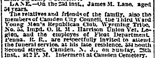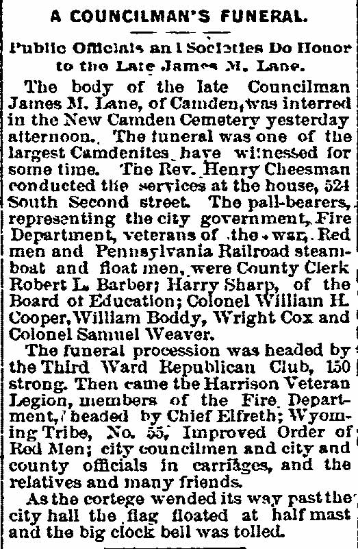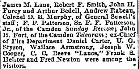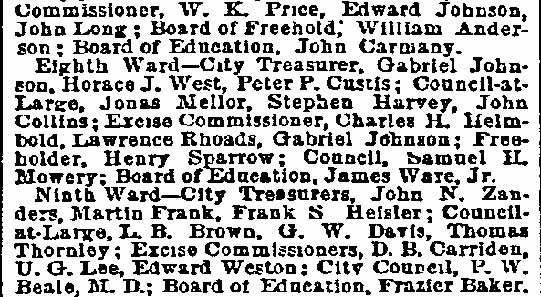 Reverend Henry Cheeseman Improved Order of Red Men - Third Ward Republican Club Harrison Veteran Legion - Samuel S. Elfreth - Robert L. Barber Harry C. Sharp - Wright Cox - William Boddy- James M. Lane Colonel William H. Cooper - Colonel Samuel Weaver |