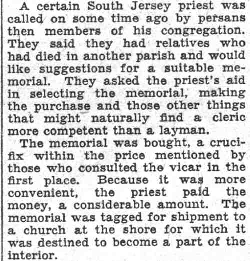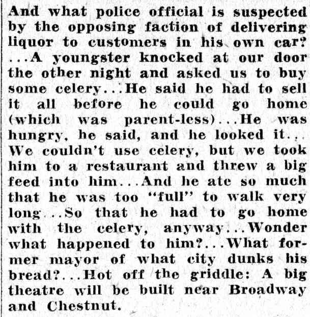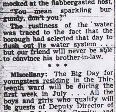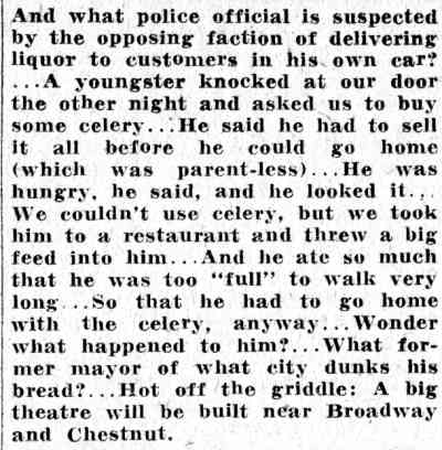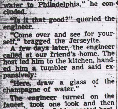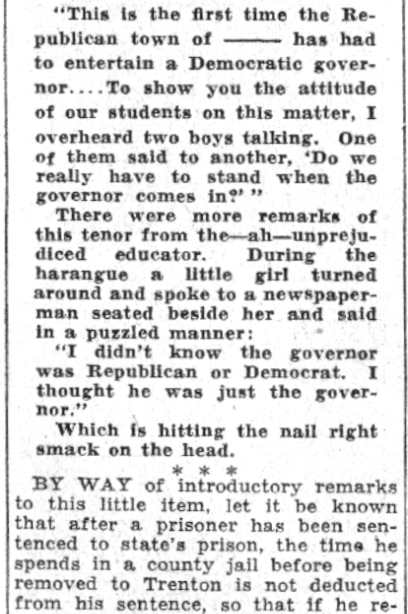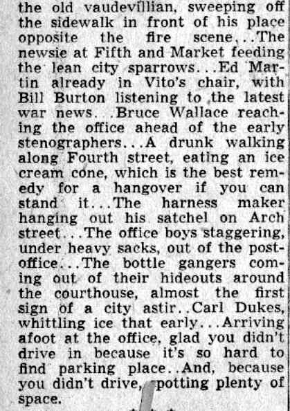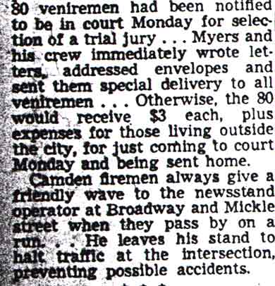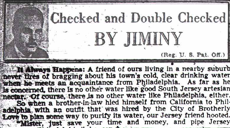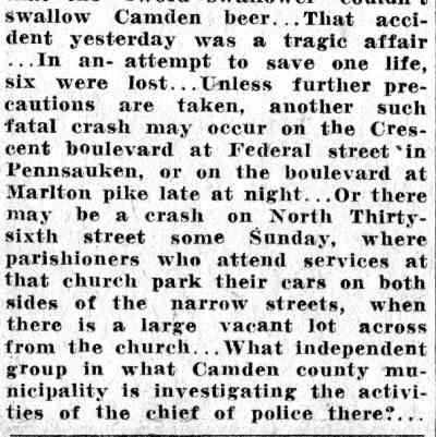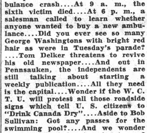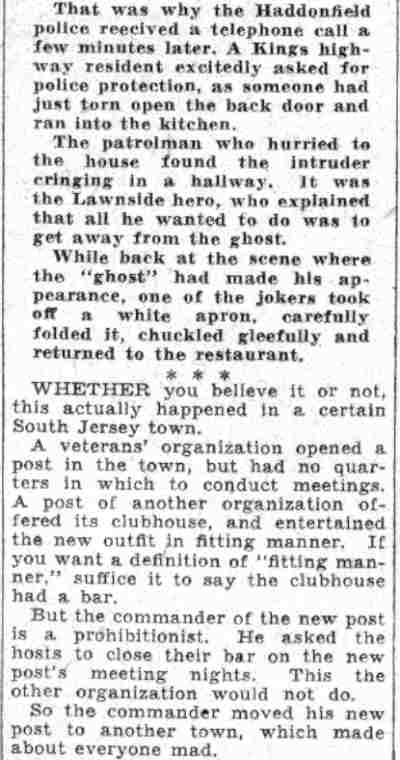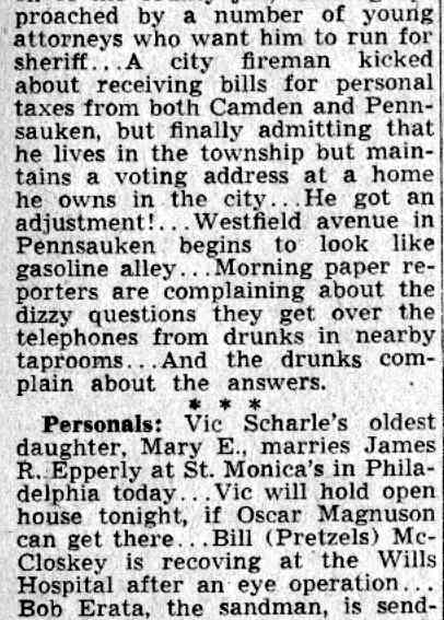 When the trial of Harry J. Green and James A. Toland was postponed for the fourth time yesterday, Prosecutor Baldwin declared that the two men were trying to avoid their day in court. Whereas to us it appeared that yesterday was their day in court. * * * FIRE CHIEF Harry F. Breder, of Egg Harbor, had an unusual experience yesterday. A fire broke out in his house, and he sounded an alarm for his volunteer company to come to his aid. But when the fire laddies got to the fire house, it was locked. They couldn't get out the apparatus until someone found the keys. By the time they got to the fire chief's home he had extinguished the blaze himself. We wonder what Chief Breder thinks of his fire company now? * * * It is quite possible that after election, there will be more voting precincts added in Camden and various municipalities in this county. The law provides that just so many votes, 600, we believe, shall be in one district. If there are enough over that, then a new district is made. At pres-ent, there are some 69 precincts with more than 600 eligible voters in Camden city and county. But what we started out to say is that each member of each local election board gets $25 for his election day's work in counting ballots, etc. This is regardless of the size of the precinct. Thus, for instance, an election officer in Tavistock receives $25 for counting 25 votes. As there are four such officers, it costs $4 to handle and count a vote there. On the other hand, an election officer in, say, the first precinct in Pennsauken gets only $25 a day. There are 134.5 registered voters in that district, so that its officers have more than 110 times as much work to do for the same money. * * * YOU'VE probably had a drink there yourself. We mean at that public fountain in Independence Square, Philadelphia. The fountain gives off chilled water from ice tanks below the pavement. The fountain was originally placed in Fairmount Park as part of the Centennial Ex-position in 1876 by the Sons of Temperance who still take care of it. Which is of some interest, as the temperance fountain is but a few feet from the Liberty Hall. * * * Judge Pancoast calls to our attention to the fact that on the road from Hammonton to Tuckahoe is a sign post, on one hand of which is the legend "Three Miles to Dorothy" and on the other "Five Miles to Pancoast" … The judge's daughter is Dorothy Pancoast … Speaking of fire departments, as we were a few paragraphs ago, there is a certain gentleman living in the suburbs who, when there was a fire alarm for the volunteer firefighters, would turn over and keep on sleeping … But he has since been named traffic director or something while there is a fire going on… Maybe the appointment was his reward … And now Einstein says there may be a fifth dimension … When most folks would like to have a meal with two dimensions … Square … A fan writes in to say that he reads this pillar with much disgust … So that there is still some hope, as he reads it, anyway … By the by, we once more reiterate that whoever the shoe fits should wear it … Which is why we often leave out names … That is the reason why two chiefs of police in South Jersey are sore on us … We said there is a chief who not only holds out robberies from reporters, but doesn't even tell his own men about it … The two who are angry now are the one whom we meant and another who thinks we meant him … How do you like the City Hall tower in its new lighting effects! |