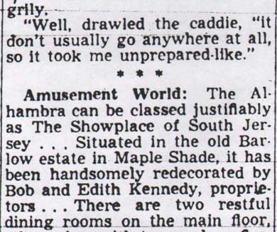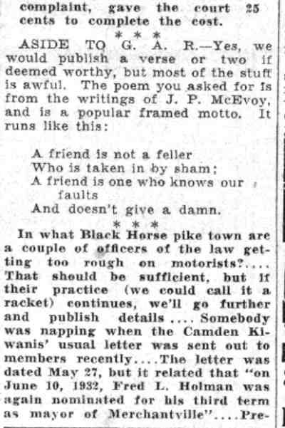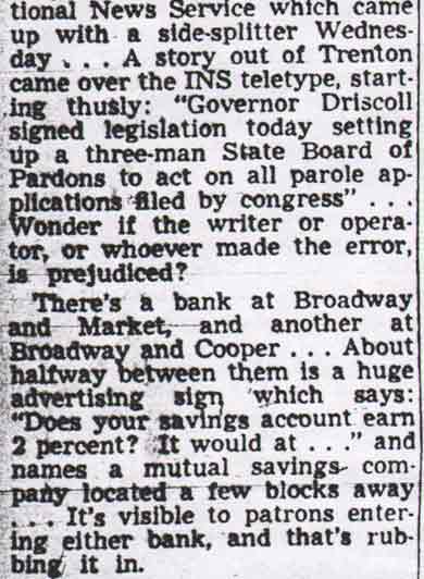 The strongest kind of onions to the bridge cop who almost caused an auto accident at Eighth and Federal streets Monday afternoon because of his own reckless driving… He dashed out of Eighth Street and started across Federal… Another car almost hit him… The cop stopped in the middle of the street and bawled out the other driver, bullying him and threatening to arrest him for not stopping on what really is a through street… When the cop had no jurisdiction there anyway. Allen Hughes says this really happened in a local apartment house… A young feller had to attend a social function, so he donned his tux but just couldn't manage the tie… So he summoned up his nerve, went to the next-door apartment and knocked on the door… A man an-swered and the partyite asked him to tie the tie. , . ,"Sure, but you'll have to lie down," agreed the neighbor… This was done and a swell bow was tied… "But why," asked the young man, "why did you ask me to lie down so that you could tie it?" , ,.' , "Because," smiled the accommodating neighbor, "that is the only way I can do it. You see, I'm an undertaker!" What doctor in Camden County is being investigated by narcotic agents?… That White Horse pike cop who went to another town on the Black Horse pike to direct traffic during a fire wasn't so helpful after all….. In a few minutes, he had Sunday shore traffic In a hopeless snarl…. One of the staff tried to call Ollie Stetser up at Gloucester 201….Someone answered the telephone and it wasn't Ollie… Finally it devel-oped that the number was Gloucester 101… Whereupon the staff worker called back the operator and yelled, "I want 201, but you gave me 101"…. "Well," the operator ex-cused herself, "201 was busy"… “How nice… Do you have any 1000s or 7000s?… What subur-ban school changed speakers at a school function because of bank troubles? We drove up to Yonkers, N. Y. over the weekend, and that North Jersey shore traffic makes the White Horse pike look like a deserted town… Recently the mayor up there asked the townsfolk to buy municipal bonds, because the city was in rocky financial straits and needed money to operate , .. The bondholders, he promised, would be paid six percent interest, or more than twice as much as the banks paid , , , So the, people bought municipal bonds, drawing their money out of the banks…Within a week $3,000,000 was with-drawn from one of the town's largest banks… and the bank closed its doors….. ' Then we took a ride along the Palisades, and on the west side of the Hudson, viewed some estates… Untermeyer's estate looks bigger than Holland and Greece put together … and the estate of Billie Burke, Flo Ziegfeld's widow, has a big "For Sale" sign on it… and believe it or not, we brought some rocks all the way back for our now famous rock garden. |