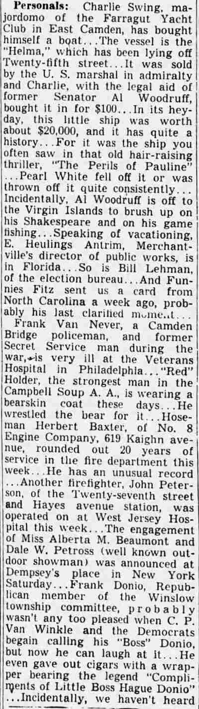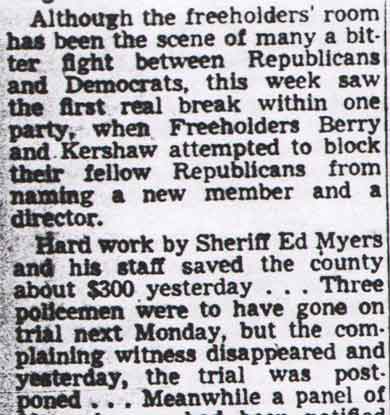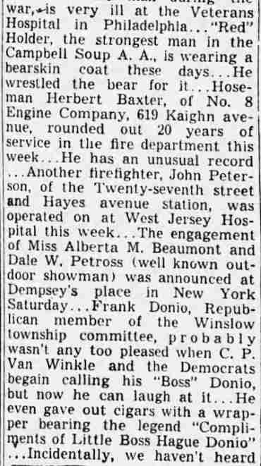 The way some of the members of the Camden County Republican Committee are behaving these days, the Democrats can stay home on their own meeting nights .... The Republicans are doing their work for them .... Now some 70 of the Republican committeemen have signed a petition to give Baird a job that won't pay him anything.... It's about time they're giving him something .... They took the U. S. Senatorship away from him .... Moore took the governorship away from him .... Woodruff took the state committeeship away from him .... The New Deal took the city commission away from him .... The New Deal took the freeholders away from him:.:. Somebody always is taking something away from Baird .... It isn't a question of Baird's ability to fill the bridge job .... The only one to even mention that as an issue was Fred von Nieda .... He's a city commissioner, you know .... It's a matter of principle .... At least, that is what Florence Baker, state com-mitteewoman, says .... Mrs. Baker is telling Senator, Clee and others at Trenton that they owe it to Baird to support him for the job because he has always helped Clee ...Let's, in all fairness to Baird, look at the record .... In the primary, during an address at the First Ward Republican Club, Dave Baird stated he was for Cliff Powell against Clee .... Mrs. Baker did not come out against Clee .... She didn't come out against Powell. Instead, she said she was neutral. In the general election, Mrs. Baker said she was for Clee. baird never said he was for Clee. (If he had, Clee's majority of 35,000 would have gone to Moore) .... So we don't think that Mrs. Baker is very convincing when she tells Clee that baird helped Clee .... She said that the Camden county legislative delegation helped Clee's program against Hoffman. Was baird a Democrat last year? Sheehan, Roye and Lodge were .... Burling was a Republican, and helped Clee, but he is not for baird. Perhaps it was because baird "helped" Clee's program against Hoffman opposition, that Hoffman slipped in baird's appointment without the knowledge of Burling or the state or county committee members .... Mrs. Baker stated at a banquet that she has copies of the Courier-Post in 1931 in which baird was praised for his bridge work .... If anyone cares to look at our files, we will show what Mrs. Baker said about baird in the neighborhood of 1931. ... Or what we said about baird at other times .... Also what Mr. van Nieda and Frank Travaline said. But enough ado about nothing .... All we've done is talked about baird when it had been our plan instead to talk about politics. * * * The political ax is hanging over the head of a Mt. Ephraim official on the charge he is assuming too much authority ..... The political ax hanging over the heads of the Delaware township cops is about to be enmeshed in litigation .... One of the policeman is a member of the P.B.A. which will carry his fight into court in a case that will be a precedent for the other township cops, too .... Herb Taylor will be county engineer if it goes to a Republican .... It may be a Democrat however, and newest among the candidates, on that side of the ledger is former City Commissioner Carroll P. Sherwood .... There may be only one assistant county solicitor instead of two in which case it will probably go to Carleton Rowand, city school board member .... By the way, don't, be surprised if under the new contract between the city and county on maintenance of the City Hall, the city takes full control of the building with consent of the county ... Which will be tough on some of the county jobholders ...* * *. Assemblyman Allen now denies he wants all us newspaper fellers to go to the guillotine ... He says he meant lawyers ... Charlie Humes wants to be guillotined ... Standing up ... Incidentally, Charlie is defending his last-place position in the ping-pong league tonight… Firefighter Lennox went to church the other day… And found the roof braced up. When will the borough of Merchantville fix up that dangerous hole in Browning road at the railroad tracks north of Maple Avenue? ... Or is that in the township? Whenever the state police want Detective Wojtkowiak at the prosecutor's office, ·they ask for "Sergeant Watchyourcoatandhat" … The Mt. Ephraim commissioners are going to buy a police car for their chief ... He's also in for a pay rise ... Bellmawr's chief of police won't get the salary increase he wants, but he will get an additional allowance for the use of his car ... Runnemede's two new cops will also get pay increases … The other day an alarm was sent to every police department in the county and also to the Philadelphia cops that a car had been stolen in Audubon ... The culprit is glad no cops saw him ... He was none other than a police official who wanted to borrow a storekeeper's car but took the wrong one by mistake ... His face is almost as red as Vince (deP) Costello's ... At the K. of C. roller skating exhibition the other night, Luke McKenna did a few fancy turns ... Vince recalled he, too, had been pretty good at one time, so he essayed to show his friends ... His intentions were better than his legs, and a couple of well--wishers followed him around the floor with a stretcher. This all happened quietly The Runnemede police received a complaint from two storekeepers ... It appears that a group of high school students from another town had stopped off at Runnemede to purchase some cakes ... Several other articles disappeared from the stores ... A few days later the dean of the high school went to Runnemede paid one shopkeeper $10 and the other $2.60 ... Representing the goods they said were taken ... Aside to that clairvoyant weakly editor who reported yesterday that Joe Van Meter is going to be the Republican nominee for sheriff: A sheriff cannot succeed himself in New Jersey ... Silvio Fittipaldi, former Haddon Heights High star, is a veterinarian and doing nicely ... A Philadelphia college professor who lives in Pennsauken