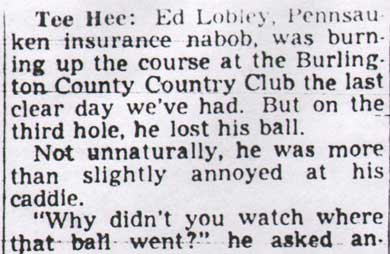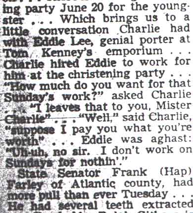 Walter E. Edge of Atlantic City, former U. S. senator and former ambassador to France. is going to build a large home in Haddonfield ... Incidentally. the city made one economy move that is costing dough-de-oh-dough ... We refere to that day three months ago when nearly all the offices in the city hall were deprived of paper towels ... For now the municipal employes are using other paper and three times as much of it as they formerly used of towels ... So that the city has to spend more than it saves ... This week we heard one of the most ironical paragraphs of the year...Or any year for that matter. In a certain municipality (you guess) a man works for the relief committee doing odd jobs here and there .. He gets a salary of $6 a week (believe it or not, Mr. Ripley) ... So a couple days ago he asked his boss, who was the relief director, for some relief for himself, as he was hungry and didn't get enough money to buy meals regularly, let alone buy clothing .. So what do you think happened? .. Sure ... He was turned down ... That pest (the one who used to claim he was Commander John D. Pennington's bodyguard) now says he has been selected as deputy U. S. marshal for this district to fill the vacancy caused by Paul McLaughlin's resignation ... By the bye, what former federal employee runs a whisper-low in Philadelphia and did so even when he worked for the government? .. It is, however, a respectable, or as respectable as speaks can be. Why, every time it rains, is the rondpoint at the airport flooded? There's the reader who asks us to warn that suburban cop ... Who has been cheating for three years with a "Wrong Number, Sir" gal .. To his children, however, he is an idol. .. That South Jersey feller who shot his woman companion and then killed himself recently ... Both were buried in the same grave ... By his wife ... Because the dead woman's relatives couldn't be found and the widow wanted her to have a Christian burial ... So orchids to her ... And, incidentally. the reports that he had filed divorce papers were erroneous ... The wife had filed suit ... Assemblyman Frank M. Travaline Jr., who forgot to duck up in the senate chambers not so long ago, is going to be married July 1. .. And on that same day a certain radio station attache and a Parkside girl are planning to surprise all their friends by getting married in New York .... Ooooh, the big tattle-tale ... But if you only knew who told us about it. ... He attended Camden High School ... The bride-to-be attended Camden Catholic High .... That young local attorney accused of tipping off some prisoners that a news cameraman was going to photograph them and who also is alleged to have threatened to break the camera denies it all ... He says it was a cop who did all that. .. So that's that. . |