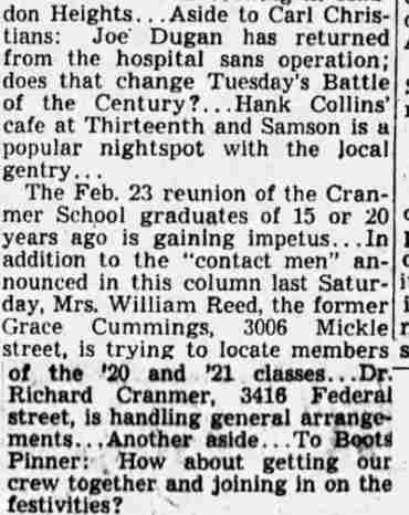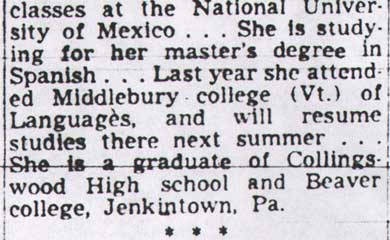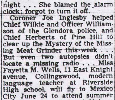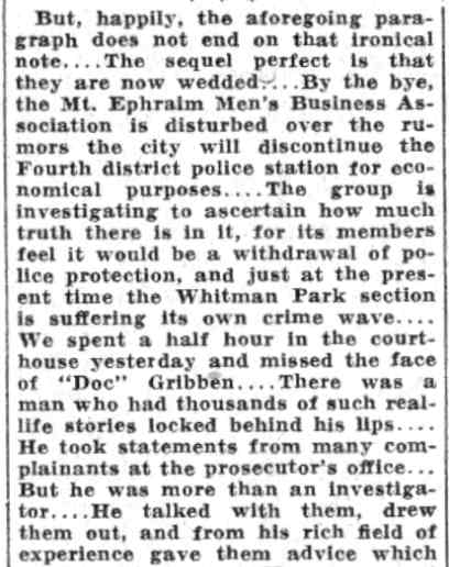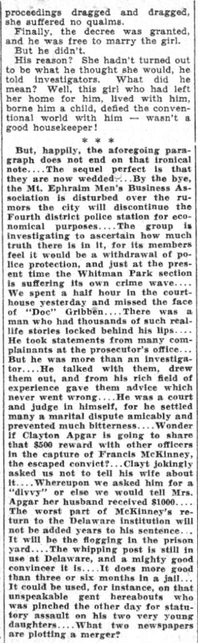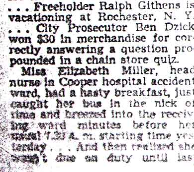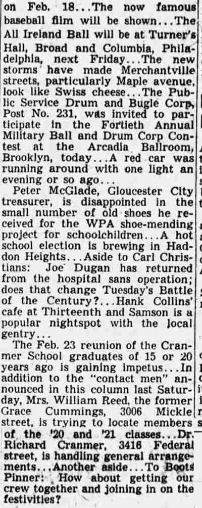 TWO IN A ROW? Several Camden High School alumni have asked what little help we can give .... To correct what is either an error or a. very mystifying circumstance .... We refer to the transfer of Miss Ruth M. Keller from the senior high school .... Where she has taught Latin for some 20 years .... She is a Fellow of the University of Chicago, and is now working for her doctor's degree at Penn .... She is a comparative philologist and specializes in the ancient languages .... Latin and its dialects .. She studied not only in this country, but abroad . . .. . At the American schools in Athens and Rome .... And is an expert at Sanskrit. ... With all of this training, experience. and culture, it appears that she is well qualified for a post she has held for two decades .... But yet the powers that be have transferred her to teach 7B in one of the grade schools! .... Where all of this adeptness, at the language's will be wasted on spelling, geography, and practically everything but the ancient languages." ... So now her many, many former students are being appealed to by her friends to inquire into the whys and wherefores ,of such an amazing tactic…And to bring 'pressure to right it. . Which brings to mind the case of the Collingswood teacher, a veteran and one of the most reliable in the system… Who has just been eased out… She was suspended and they kept it under cover .... They. fooled the newspapers with two or three stories .... And finally said that /the teacher in question had been reinstated .... The teacher, who was sporting, refused to kick, in public, about the treatment she got .... And now it develops she wasn't reinstated at all, but was given no contract to return in the Fall ... Carlton "Cy" Harris' friends are endeavoring to figure out whether his injury his embarrassment is the more painful. ... Cy, who is superintendent of city parks or has some such job as that, was overseeing the work of clearing around trees in public, property, ... And decided to demonstrate ·to his workmen how to do the job with, the least personal peril. .... Therefore, he illustrated his safety-first device by going into action .... And. nearly tearing off his thumb between a tree and a chain, .. Eddie Adamski, the escaped Mt. Holly jailbird, is hiding in the wilds near Tamaqua, Pa., according to the state troopers up there .... They expect to lay their hands on him any day .... And make him talk .... That well-known artillery communications officer who started out on a 3.2 reconnaissance ride: is still hearing things because his reel cart (that's no pun, either) took the armory door with it. ... As long as we brought up the subject of the service boys, what North Camden executive officer came home last Sunday night from a carpenters' outing?...At least it must have been that, because he was all plastered .... And didn't even see his wife's guests .... But even so, he wasn't as. bad off as the two-stripe officer who goes out on horse rides Sundays and can't show up at work on Monday ...... . Tabloid tale .... Joe Lucas, mayor of Gibbsboro, taking a bath .... Two women entering his home to ask for beer licenses .... Joe finishing his bath .... Donning a bathrobe ... And stalking out, unaware of the ladies' presence .... Subdued mirth, giggles and red face .... Epilogue ... "They got the licenses., .. And Joe is wondering how we found out about his one embarrassing moment.. |