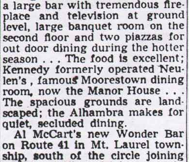 Newspaper Editor Will Revamp Former Hollywood Inn for Residence The property formerly operated as Hollywood Inn, on Moorestown Pike opposite Colwick, was sold at public sale by Pennsauken Township, Monday. It was purchased by James M. and Evelyn O’Neill, of 6718 Collins avenue. O’Neill is city editor of the Camden Evening Courier. The property was sold for $2,250. The sale was confirmed by township committee Monday night. The place had been seized for taxes. According to Township Solicitor Thomas F. Salter, O’Neill will improve the place and use it as a dwelling. The original part of the brick building is more than 50 years old and probably 100. It had a barroom nearly 50 years ago, operated by a Maple Shade resident. That was after the farm upon which it stood was purchased by L. Horning, a Philadelphia photographer, who endeavored to turn the farm into suburban homesites. Horning erected several houses, and at the same time opened an excursion park in the woods across the railroad, now part of Iron Rock Country Club. In the park was a “medicinal” spring. This was later purchased by a company that sold its water under the name of Ypsylinti Spring Water.. |