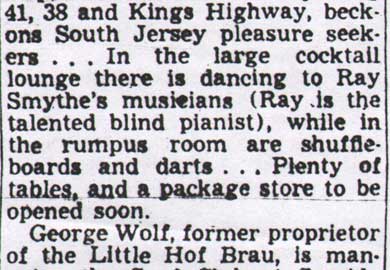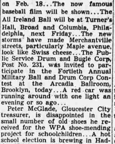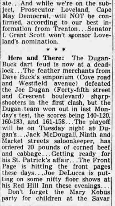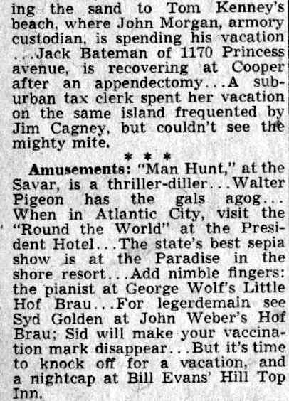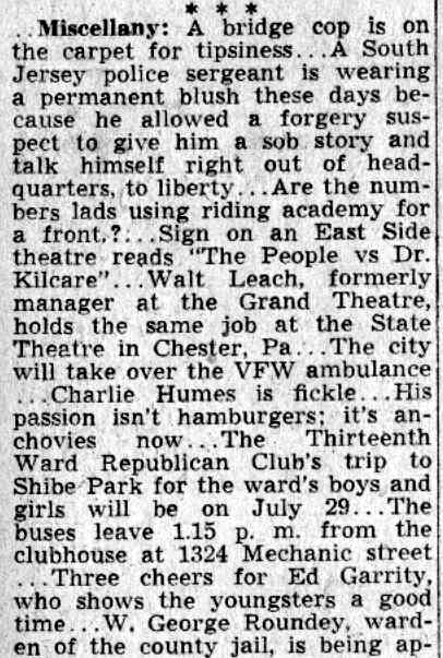 Feed Bag: Former Judge Joseph Varbalow will soon announce he has purchased the Towers and Broadway Theatres from the Ellis family ... Circuit Court Judge V. Claude Palmer will probably file his decision today in the fraud charges made by the Republican League against the election of Freeholders Ciechanowski and Francesconi ... Since Judge Palmer told the Democratic attorney, Alex Feinberg, that Feinberg must complete his entire case in a half a day "because, frankly, 1 don't see what answer you can make to this testimony," you can draw your own conclusions about what the decision will be ... Incidentally, Judge Palmer will take a plane July 12 for a vacation at Calgary in the Canadian Rockies ... The name of Walter Uliase, Seventh ward Democrat, has been withdrawn from powwows on appointments to the county tax board, .. Senator Al Driscoll was willing to okay Joe Ackroyd, Democrat, as successor on the board to Fred Schorpp, whose term expired a few weeks ago, .. The Republicans are said to have figured that in that way, they could hold Victor King on the board awhile longer, even though his term expired more than a year ago ... Lee Smith, former WPA director; is still a possibility for the tax board job ... The Democrats are holding frequent conferences on who the assistant prosecutor shall be ... Police Judge Gene R, Mariano, a strong contender, has reportedly been dropped with Ben Dzick, Tony Mitchell, Charlie Rudd and the Kraft boys still in the running ... Police court habitues believe that Gene himself announced indirectly that he had been eliminated when he said from the bench, while hearing a case, "Lady, you'll find that even your best friends sometimes stab you in the back. I found that out myself only 1 o'clock yesterday afternoon" ... That was on Thursday ... Mayor George Brunner told the dept that our guess was still I as good his, so that leaves Ben Dzick still with the fence position in the race ... Mariano may be considered for the $5000 State job as sealer of weights and measures ... At the end of each fiscal year an efficiency report on every army officer is made by his immediate superior and sent to the War Department ... Along the way, the report may undergo some changes if other superior officers also have I some information that must be considered ... In Washington, the report is combed thoroughly and if it is believed an officer is not doing a good job, he is given an opportunity to resign or he transferred to another outfit... The theory is that an officer may be incompetent in one capacity but may do a good job somewhere else, ... This is all a prelude to a tip that the brass hats at Washington have recommended transfers for 111 officers of the 114th Infantry. *** Miscellany: Neil F. Deighan, the saloonman who led the opposition to a legislative bill which proposed that liquor manufacturers and wholesalers be prevented from selling goods to any retailer who owed them money and that all purchases be made with cash or quick payment credit plan (the bill will die in committee), is having his troubles with some wholesalers ... Suits have been filed against Deighan and the Old Mill Inn, Inc., by Galsworthy, Inc., for $1713.51 plus interest; Joseph A. Reinfeld, Inc., for $1366.43 plus interest, and Majestic Wines and Spirits, Inc., for $1579.80 plus interest ... The suits are in the New Jersey Supreme Court and allegedly represent unpaid balances of liquor bills ... Tom Dickinson, courthouse custodian, is wearing a bright red face these days because the missus sent him to the store the other night for some sandwich meat for their guest…… Because of a similarity of trade names, Tom returned home with a package ... Of razor blades ... The new office of Bishop Eustace may be established at the old Rodger homestead at 721 Cooper street ... Dick Prickett, the popular old Sewell Clubber, is vacationing at New Haven, Connecticut … Dick Cranmer, East Camden tooth filler, has been ordered to active duty with the naval reserves and, may leave July 15 for Labrador ... Orchids for seven-year-old Sally Knorr, daughter of Dr. and Mrs. Edward Knorr of Haddon Heights ... She was so impressed over conversations at home about funds for defense and war relief, that she summoned her chum, Eleanor Chicle, and gathered their toys, which they sold among their playmates ... They turned over to Mrs. Charles Van Fossen, of the Women's Club Committee on Defense and War Relief, the sum of 37 cents ... Jean Deckman, formerly of Camden, recently graduated from Trenton High School and copped a scholarship ... Tony of the Black Horse Farms may retire from the liquor business and devote all his time to his building developments ... Mike, Third Street's Oscar of the Waldorf, has a new bagatelle machine ... Huzzah! ... (About time) ... Vice Chancellor Al Woodruff has left for Chile and some deep sea fishing. * * * Ether: PM reports that on Tuesday afternoon, the Brooklyn Dodgers had to win to stay in first place. The Phillies had them tied at 4-4, with two out in the 1ast half of the ninth, Brooklyn at bat. Two Dodgers were on base; and Cookie Lavagetto (batting .317) was at the plate. Fans tuned in to station WOR were tensely listening to Red Barber's dramatic report of the game. "Ball one," yelled Red. "Strike one . , . Ball two … Ball three… .. Strike two… Here's the pitch!….” The clock hand leaped to 5:45 p.m. and the radios tuned in to WOR suddenly blared out "Captain Midnight ... " Alas, Cap'n Midnight didn't tell what the pitch was .. The next day's sporting columns informed the WOR listeners that the Phillies won out in the tenth. *** Amusements: For that cooling--off swim: Airport Pool ... For a satisfactory glimpse of moviedom's newest oomph ambassadress, Veronica Lake ... the Stanley Theatre with "I Wanted Wings" … For circus acts, Clementon Park ... For stage show, the Towers Theatre ... For a quick cooling-off during lunch hour… the lobby of the Savar ... For dinah shore,